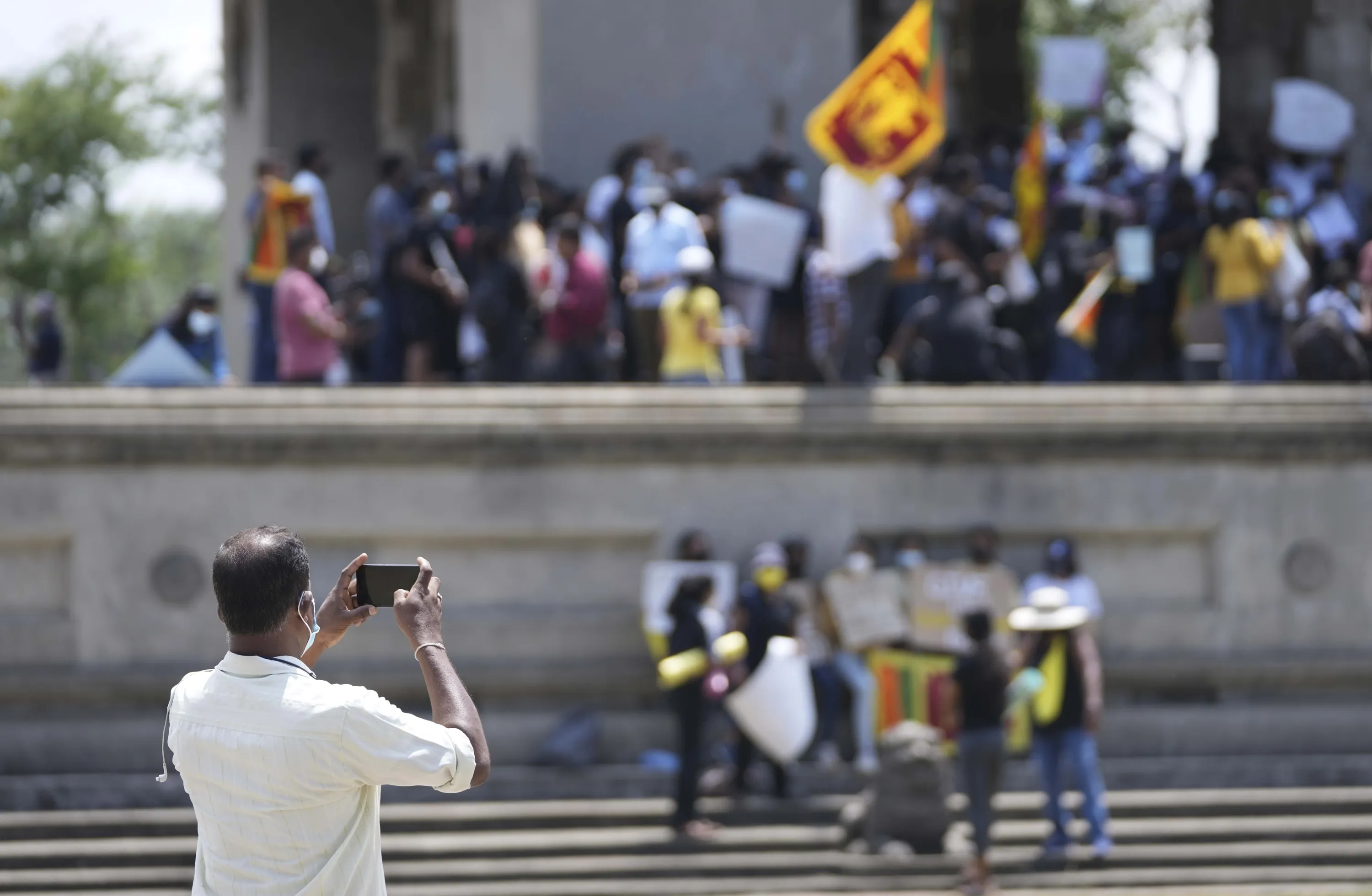 A plain clothed government security agent photographs Sri Lankans protesting demanding president Gotabaya Rajapaksa resign in Colombo, Sri Lanka, Monday, April 4, 2022. Sri Lanka’s president on Monday invited all political parties represented in Parliament to accept ministries after his Cabinet resigned amid public protests over the country’s worst economic crisis in memory that has caused shortages of food, fuel and medicines. (Photo by Eranga Jayawardena/AP Photo)