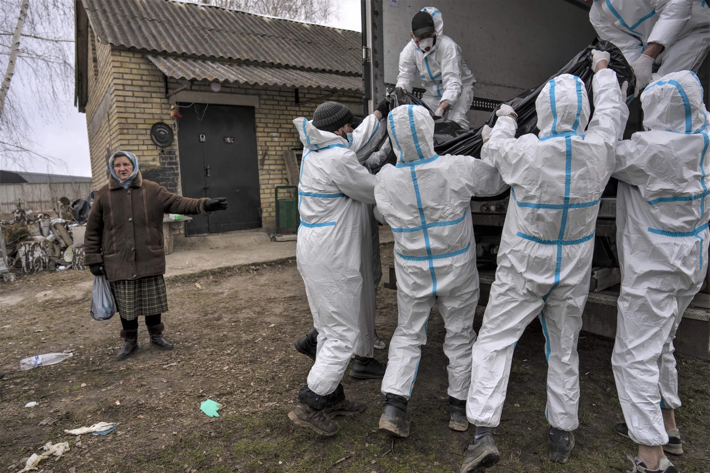 Nadiya Trubchaninova, 70, left, stands next to volunteers while loading a plastic bag that contains the body of a civilian killed by Russian soldiers into a truck, in Bucha, in the outskirts of Kyiv, Ukraine, Tuesday, April 12, 2022. (Photo by Rodrigo Abd/AP Photo)