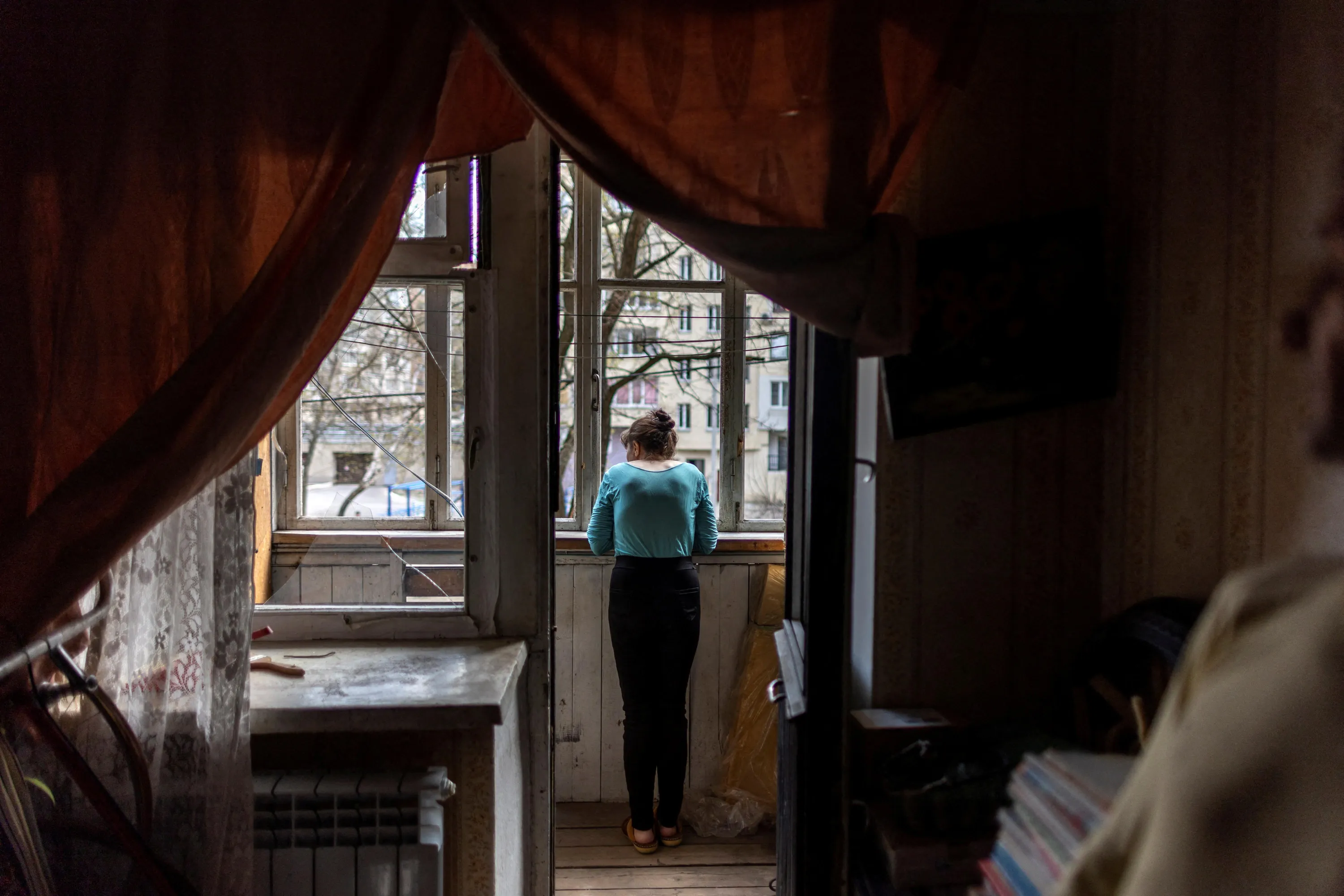 Local resident Olena looks from the window of her apartment damaged by shelling, as Russia's attack on Ukraine continues, in Kharkiv, Ukraine, April 11, 2022. (Photo by Alkis Konstantinidis/Reuters)