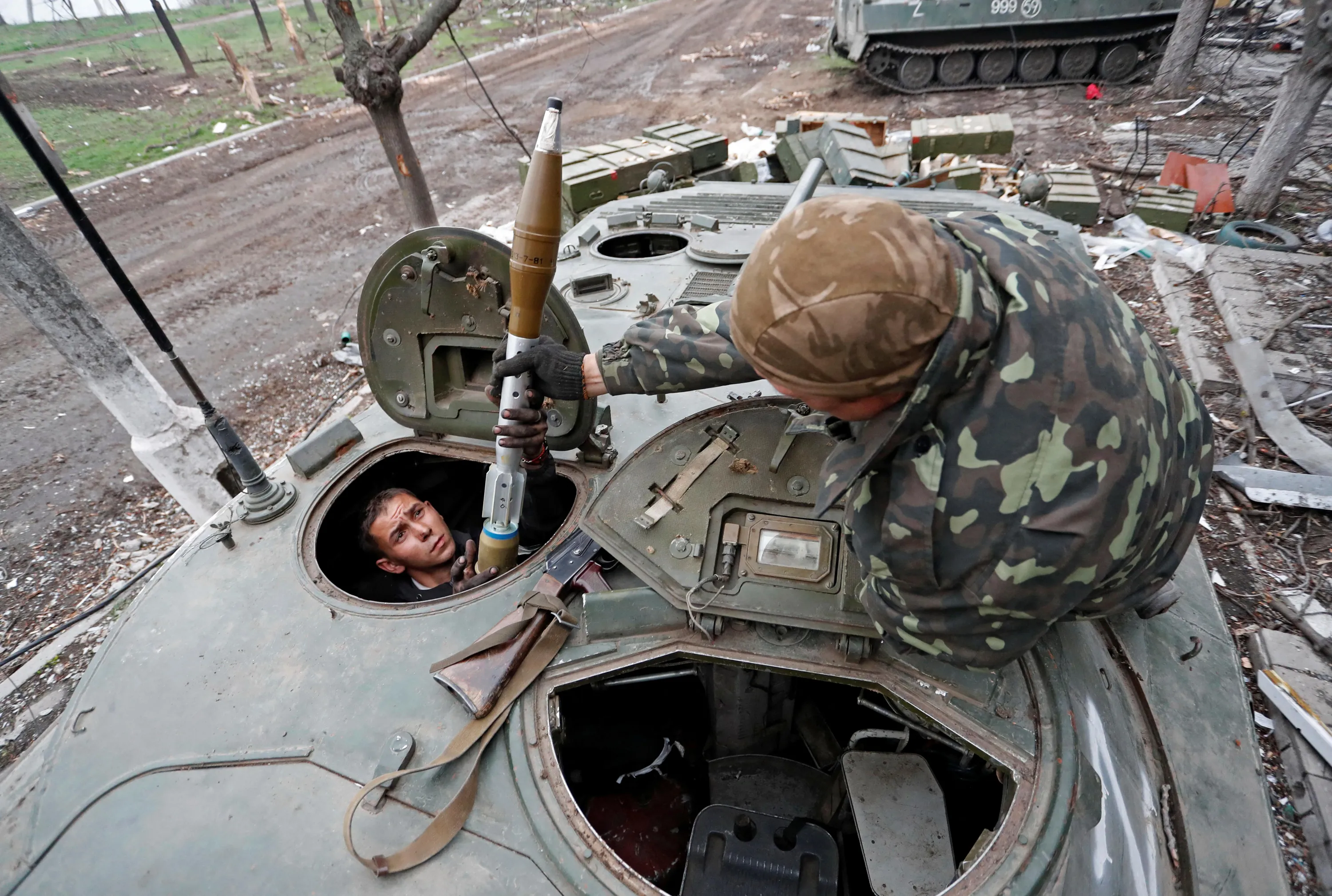 Service members of pro-Russian troops load rocket-propelled grenades into an infantry combat vehicle during fighting in Ukraine-Russia conflict near a plant of Azovstal Iron and Steel Works company in the southern port city of Mariupol, Ukraine on April 12, 2022. (Photo by Alexander Ermochenko/Reuters)