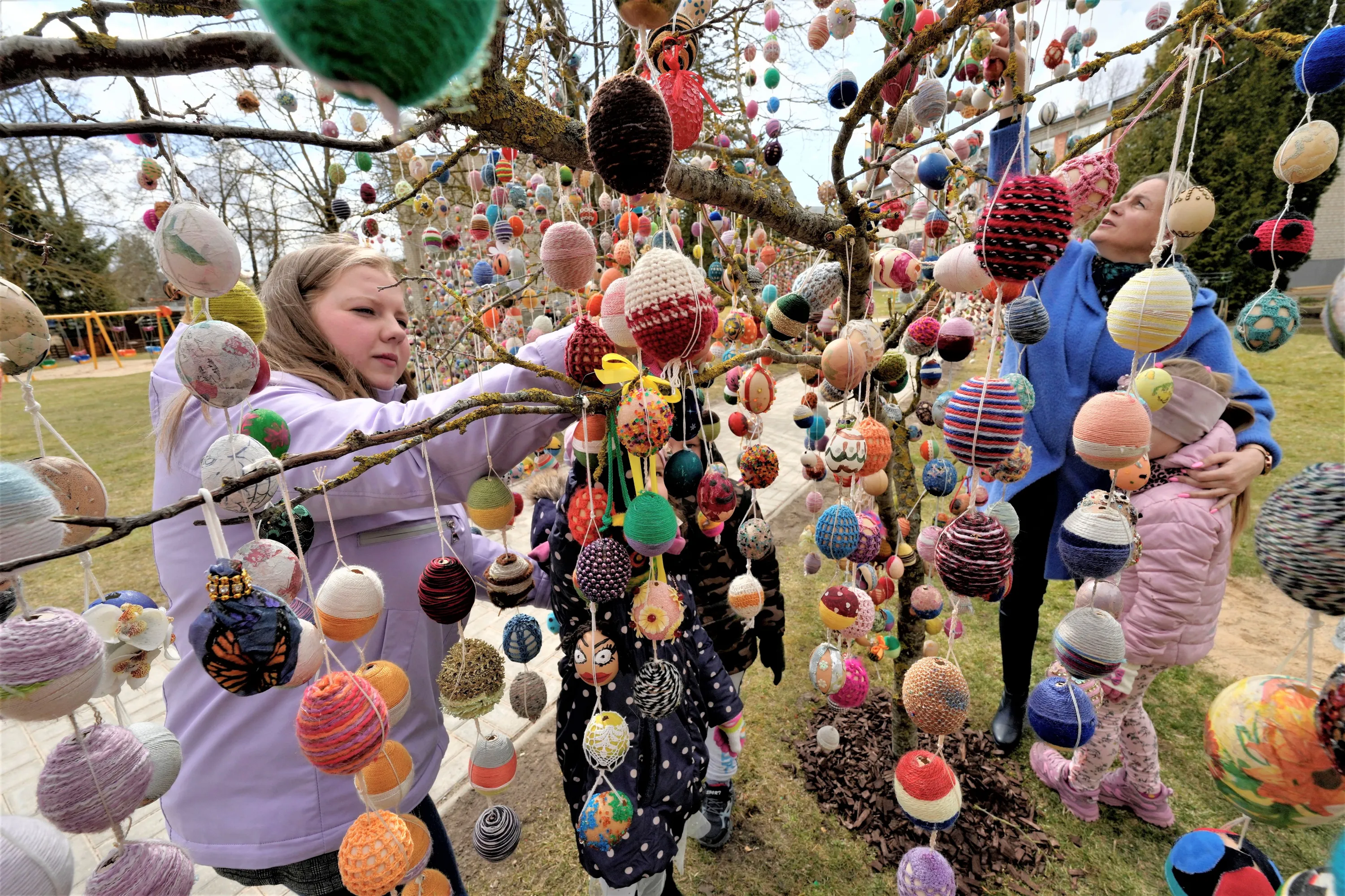 People decorate a tree with Easter eggs in the kindergarten in Seduva, Lithuania on April 11, 2022. (Photo by Ints Kalnins/Reuters)
