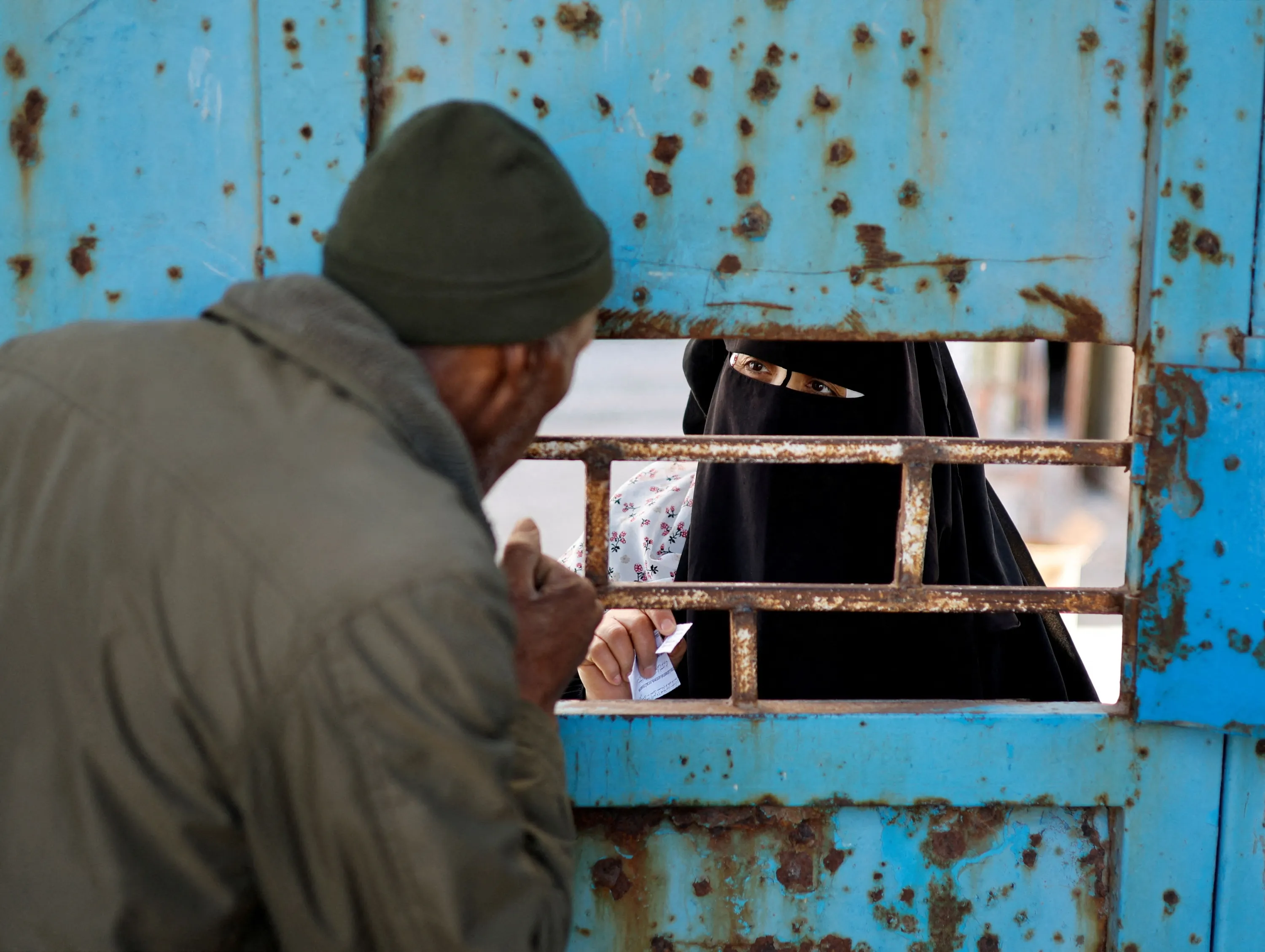 A Palestinian woman waits to receive food supplies at an aid distribution center run by United Nations Relief and Works Agency (UNRWA), at Beach refugee camp in Gaza City on March 10, 2022. (Photo by Mohammed Salem/Reuters)