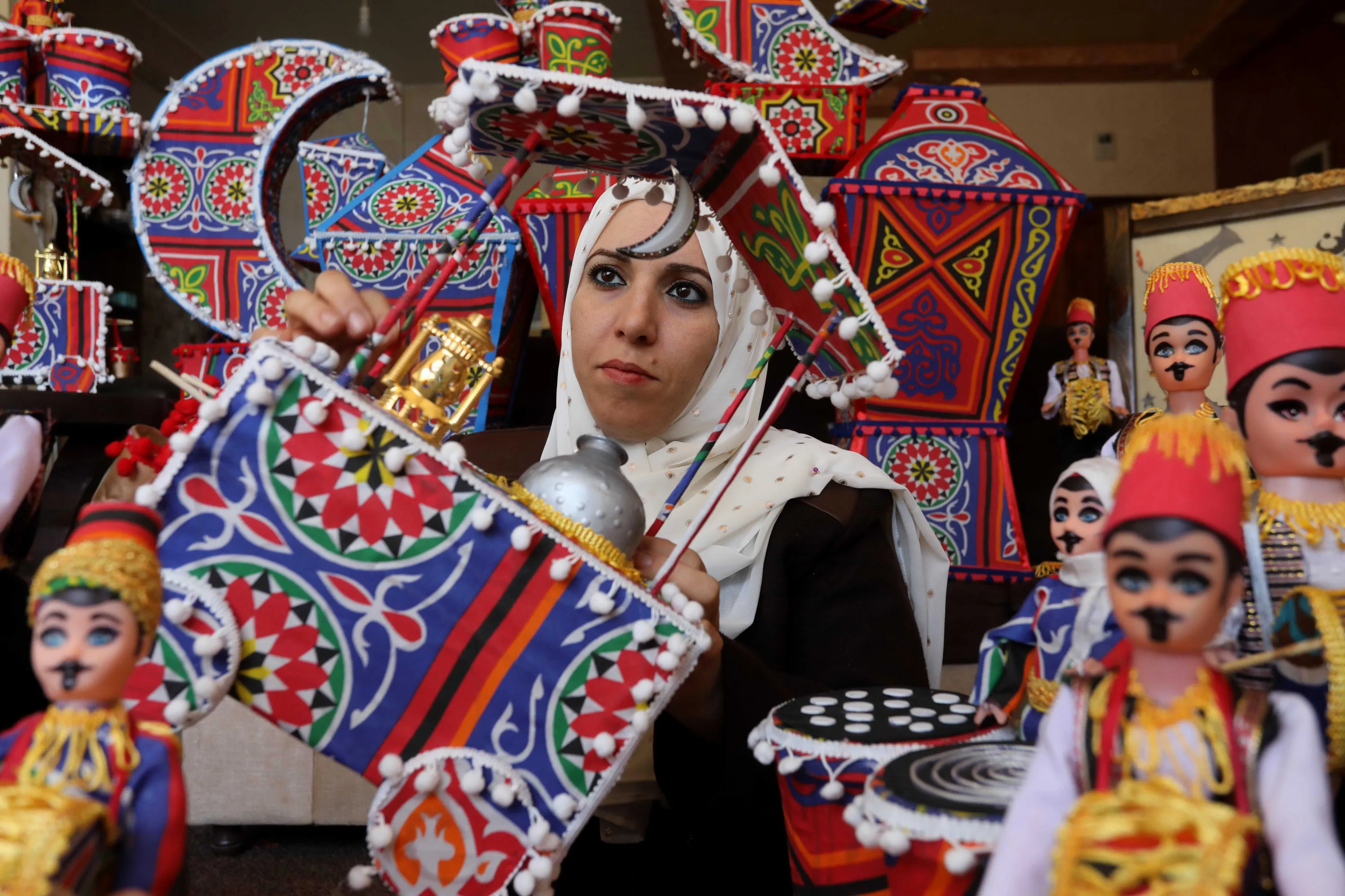 Palestinian Hanan al-Medhun (37) produces Ramadan drummer toys, colorful lanterns and crescent-shaped decorations at her workshop located in Al-Shati Refugee Camp, days before Ramadan in Gaza City, Gaza on March 15, 2022. (Photo by Ashraf Amra/Anadolu Agency via Getty Images)
