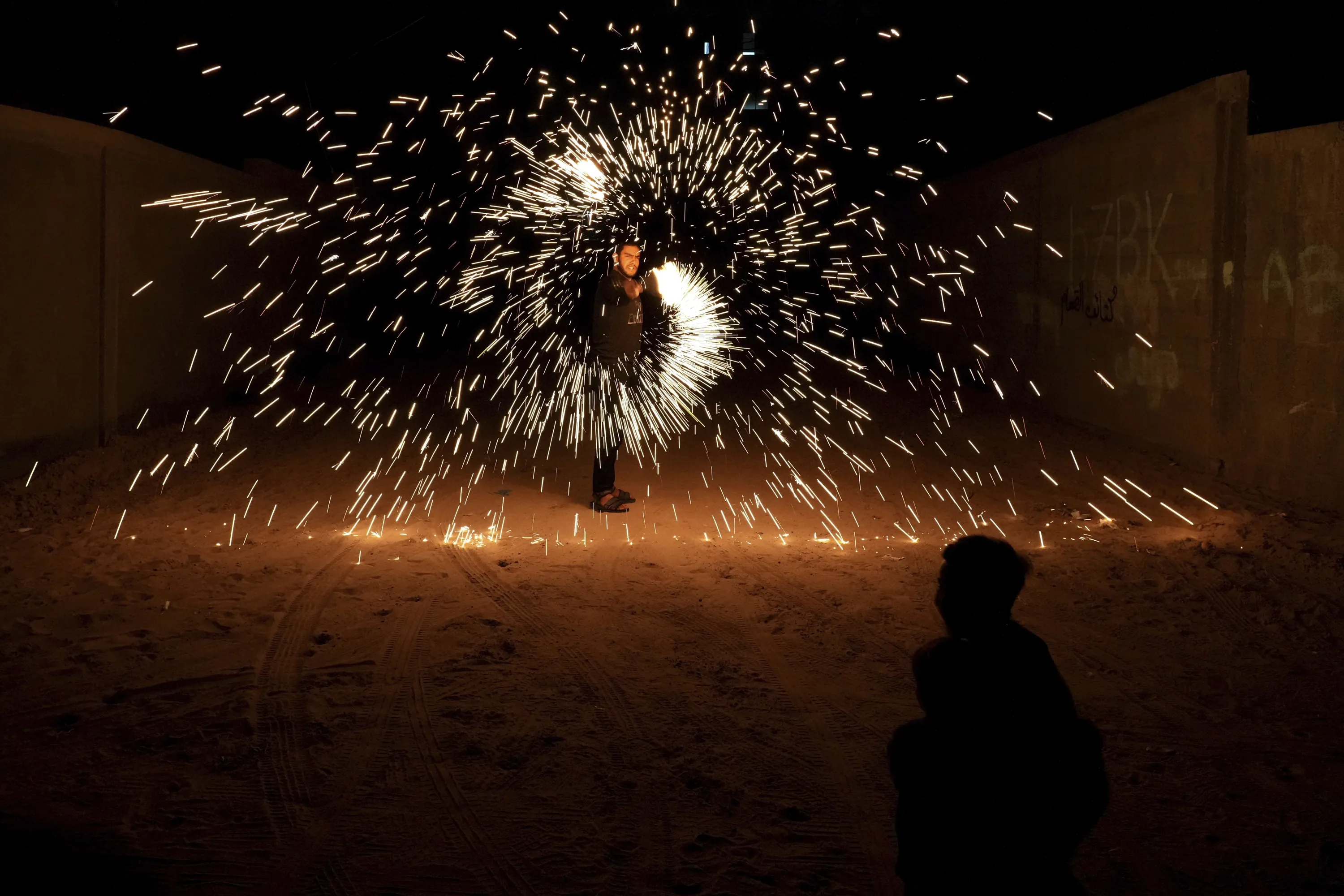 A man swings fireworks during the Muslim holy fasting month of Ramadan, in Gaza City, Saturday, April 2, 2022. (Photo by Hatem Moussa/AP Photo)