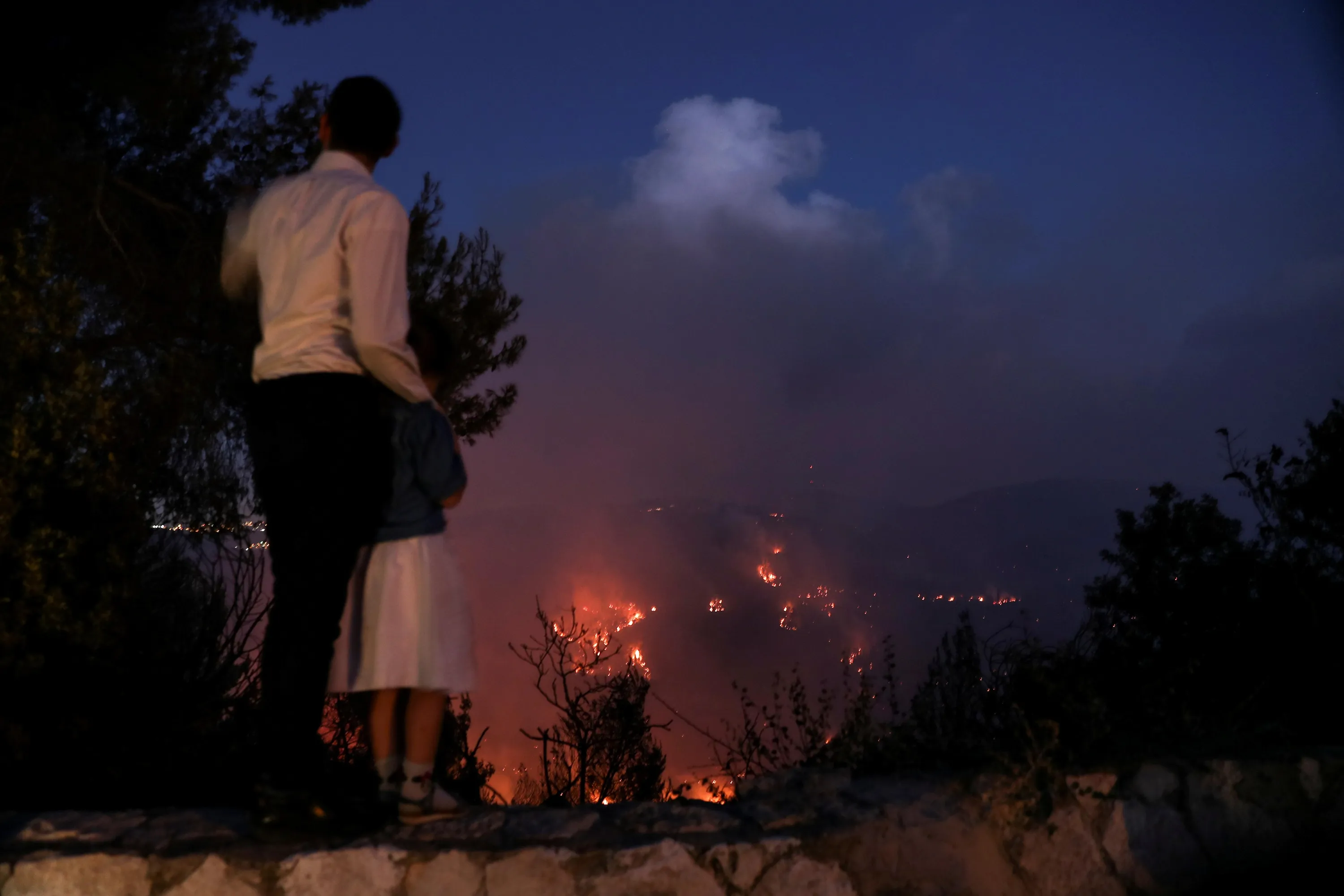 A man and his daughter watch as wildfire burns on the opposite mountain near Shoeva, on the outskirts of Jerusalem on August 15, 2021. (Photo by Ronen Zvulun/Reuters)