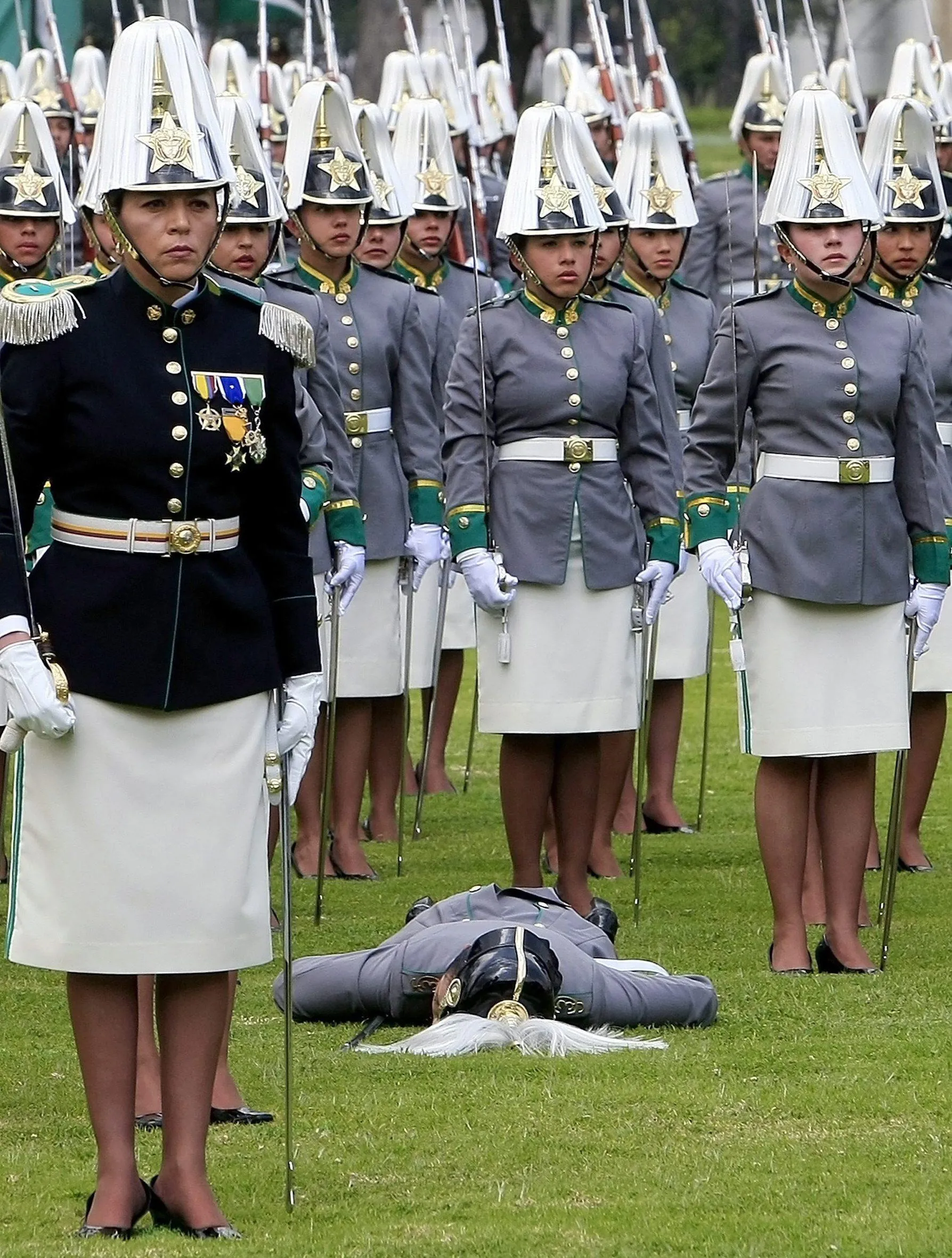 A female cadet, member of the General Francisco de Paula Santander Cadet's School, faints during the Colombian Police 121th Anniversary ceremony in Bogota, Colombia, on 2 November 2012. Colombian President, Juan Manuel Santos, and his counterparts from Costa Rica, Laura Chinchilla and Honduras, Porfirio Lobo attended the event. (Photo by Leonardo Munoz/EPA)