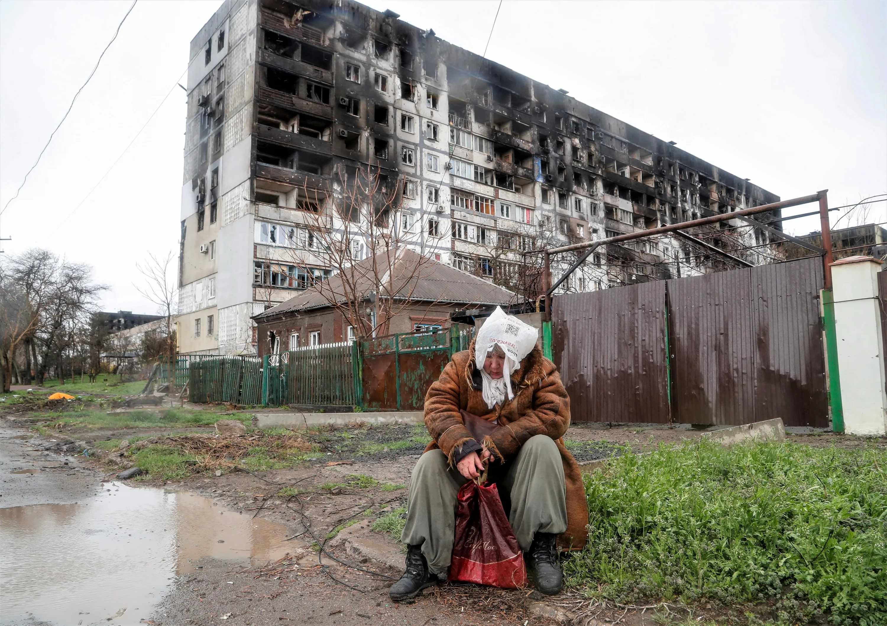 A woman sits in front of a residential building damaged in the course of Ukraine-Russia conflict, on a rainy day in the southern port city of Mariupol, Ukraine on April 13, 2022. (Photo by Alexander Ermochenko/Reuters)