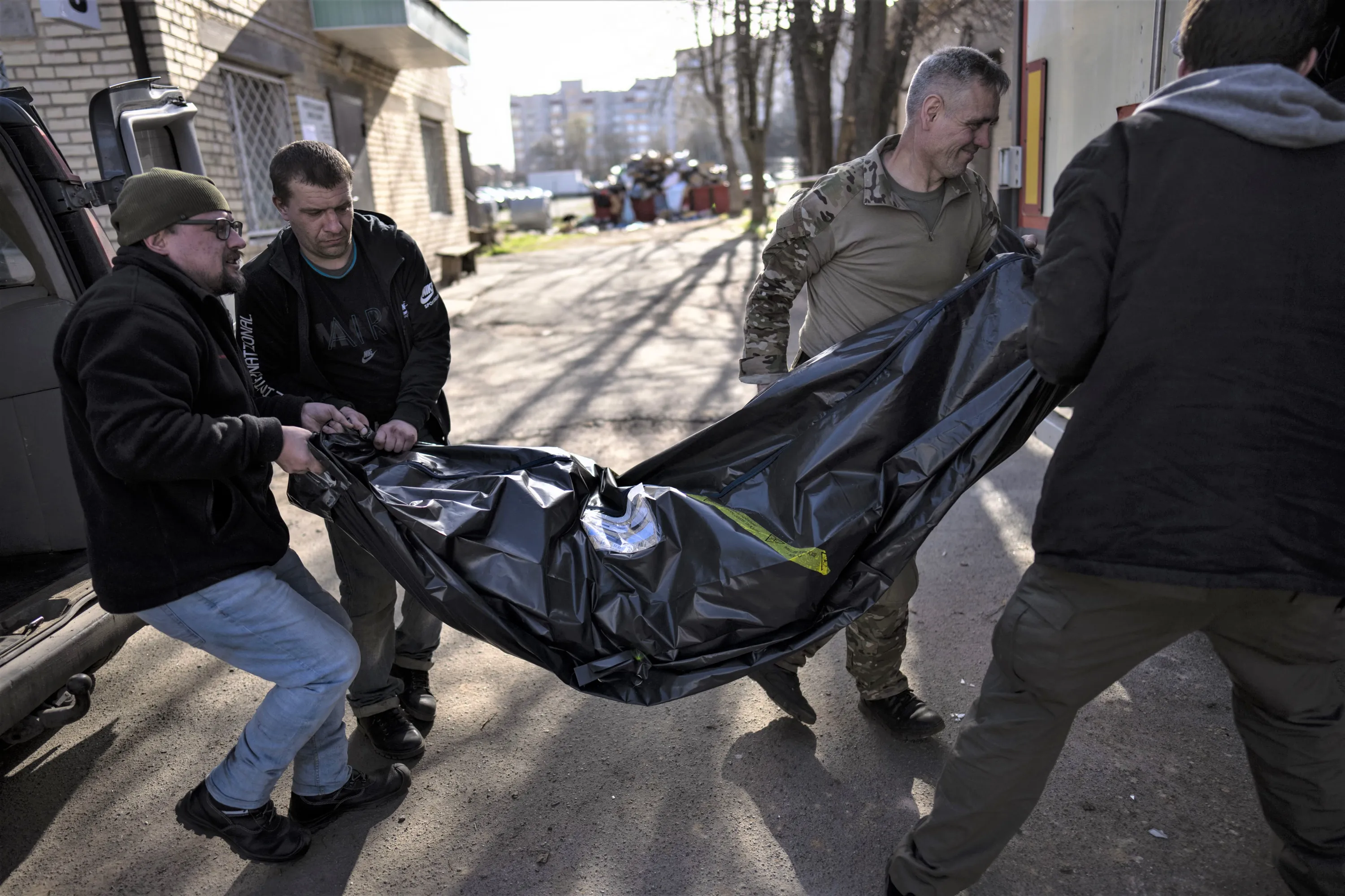 Volunteers carry the body of a man killed during the war to a refrigerated container in Bucha, in the outskirts of Kyiv, Ukraine, Thursday April 14, 2022. (Photo by Rodrigo Abd/AP Photo)