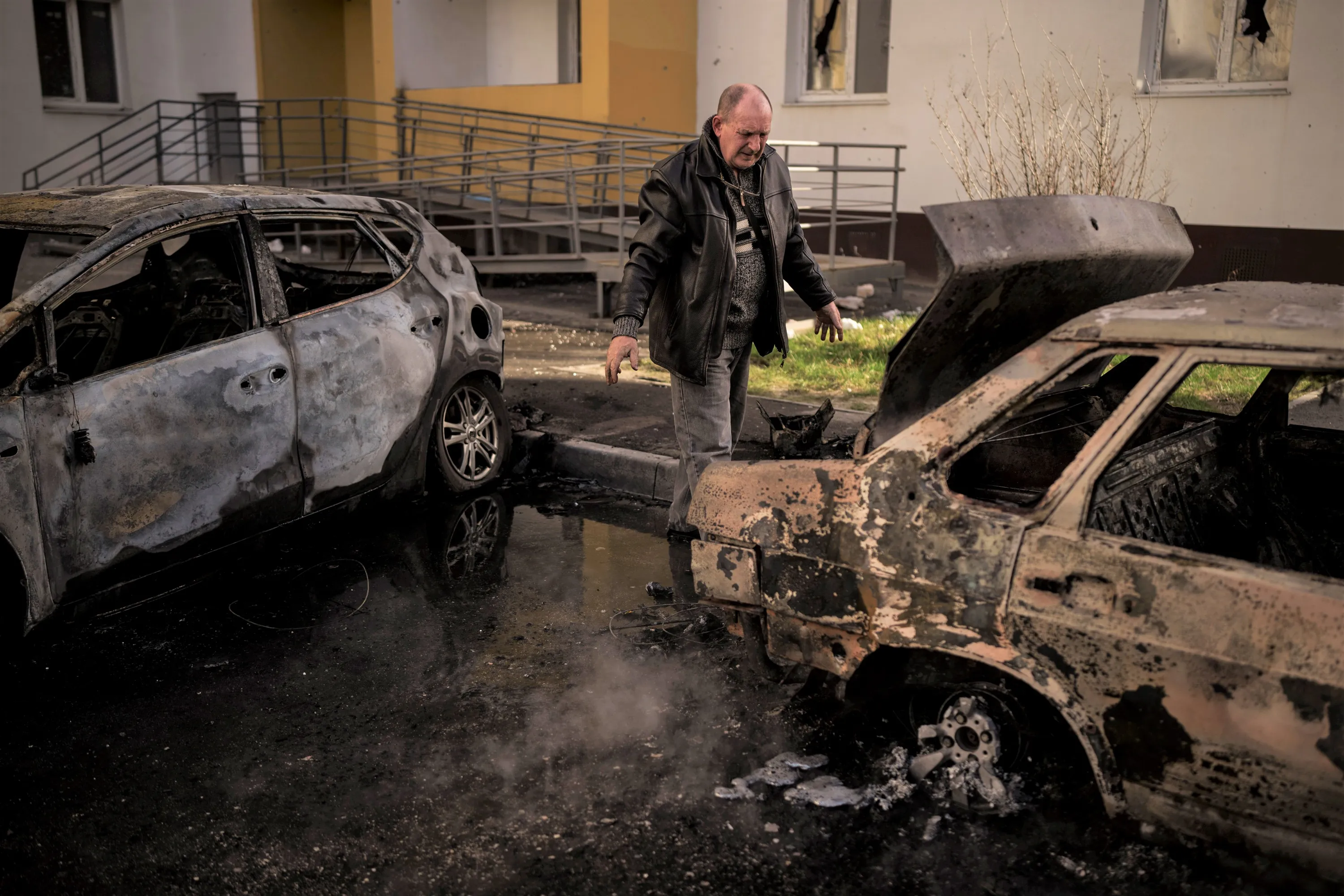A man looks at his burned car after a Russian attack in Kharkiv, Ukraine, Friday, April 15, 2022. (Photo by Felipe Dana/AP Photo)