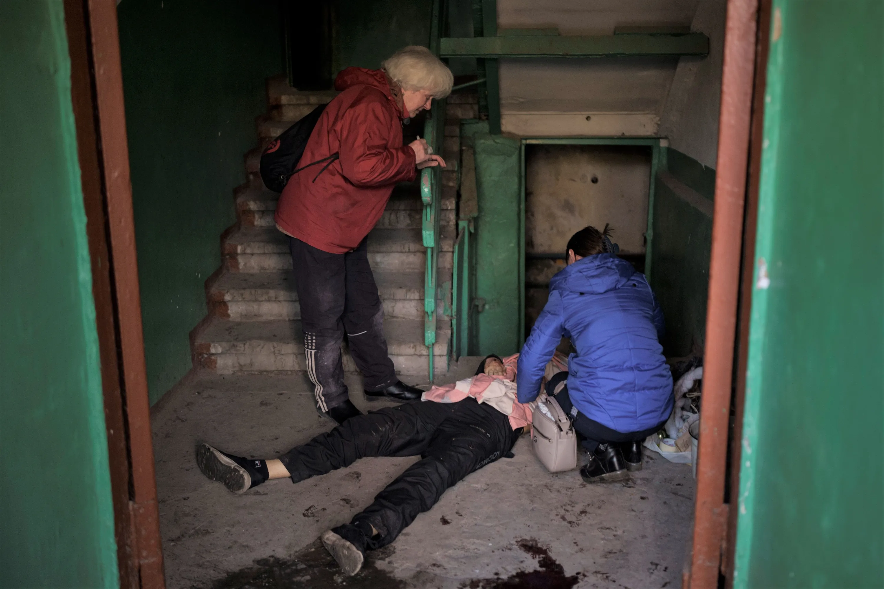 Nina Shevchenko, right, mourns next to the body of her 15-year-old son Artem Shevchenko, who was killed in a Russian attack in Kharkiv, Ukraine, Friday, April 15, 2022. (Photo by Felipe Dana/AP Photo)