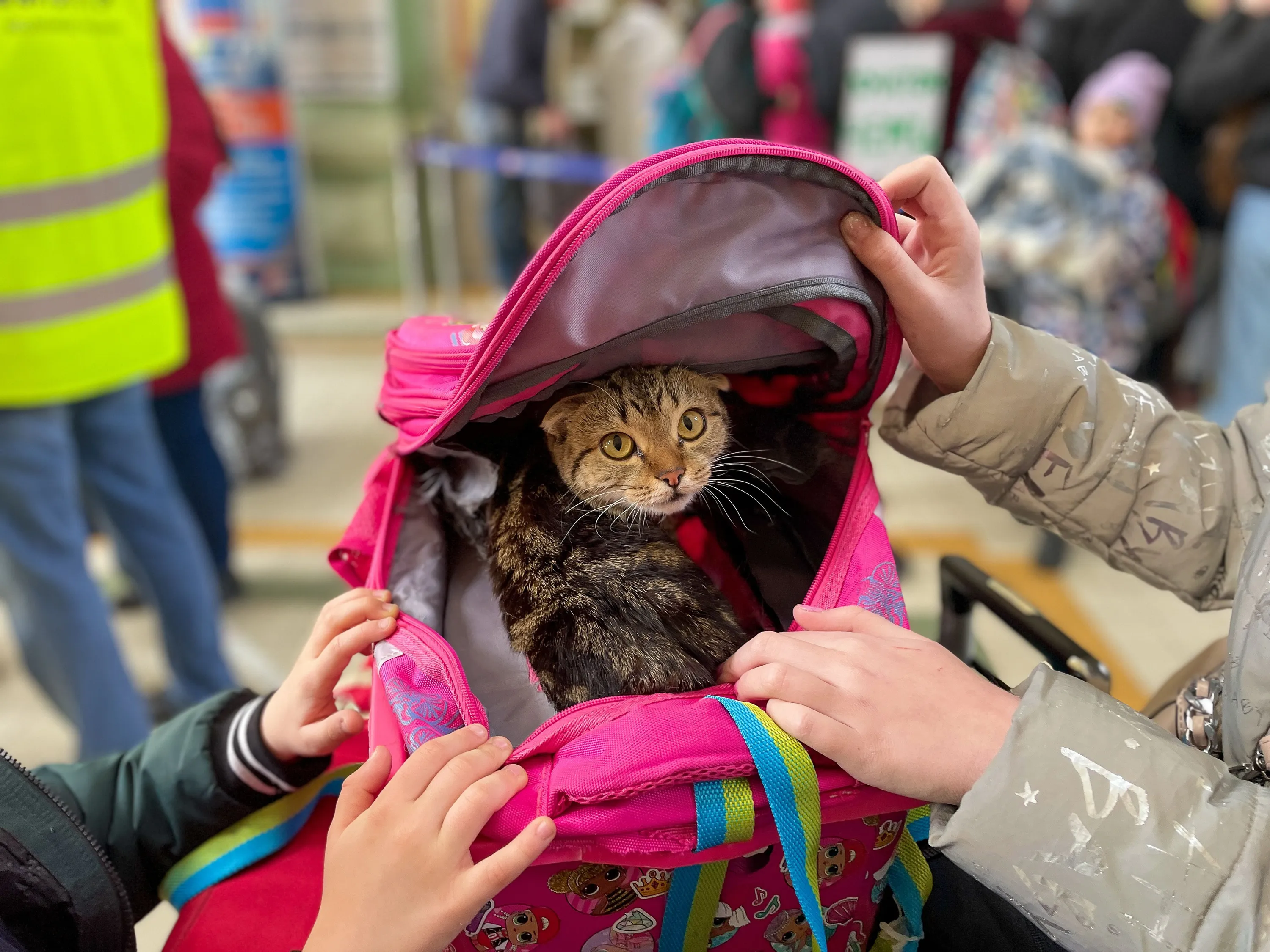 A terrified cat in a pink carrier with cartoon girls on it is held by a Ukrainian refugee girl and boy as they wait in front of the long line where their mother is trying to get train tickets at Przsemysl station on April 8, 2022, to travel to a new home in Poland where they will stay until Putin's reign of terror ends and they can return home. Many animals are turned away at the border, and there is nowhere to shelter them; hundreds of thousands of people are being forced to abandon their pets. The war is causing a crisis of unimaginable magnitude for pets, along with the families who love them. (Photo by Amy Katz/ZUMA Press Wire/Rex Features/Shutterstock)