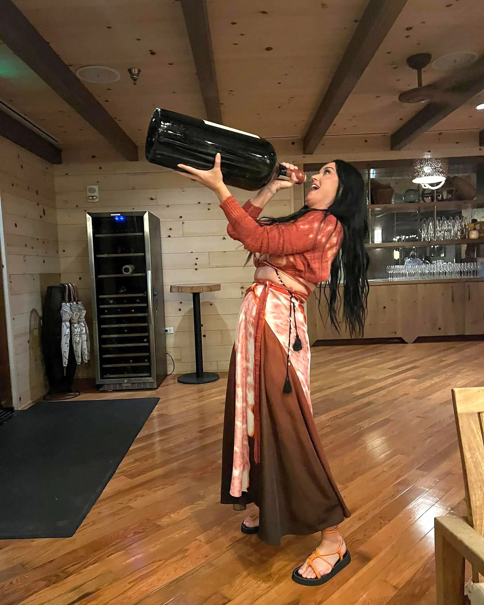 American singer-songwriter Katy Perry gets after it with a giant bottle of wine in the second decade of April 2022. (Photo by katyperry/Instagram)