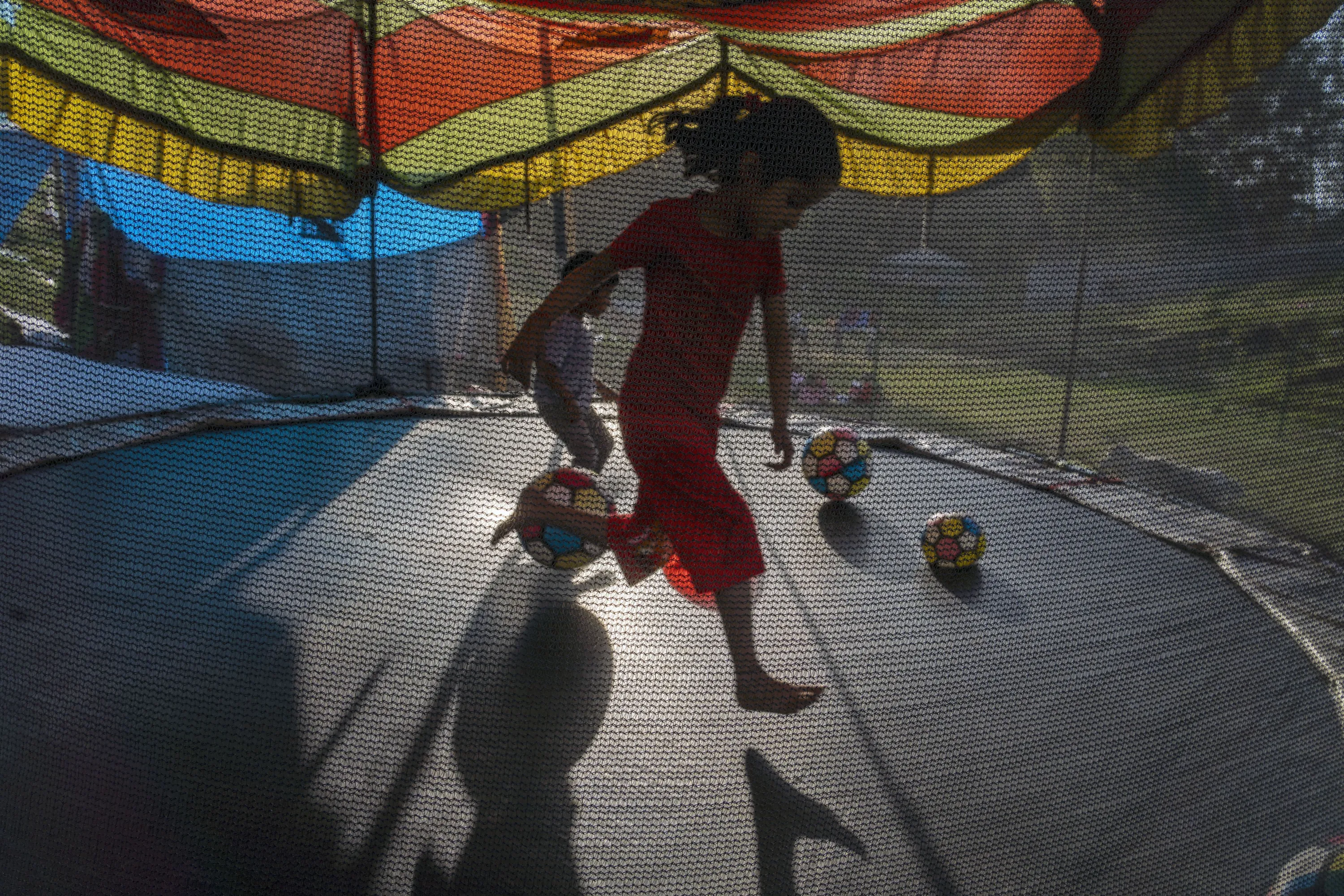 A girl plays on a trampoline at a local fair in Paror, about 40 kilometers (25 miles) south of Dharmsala, India, Tuesday, March 22, 2022. These local fairs, once an annual feature, are slowly returning after being cancelled during the Covid pandemic. (Photo by Ashwini Bhatia/AP Photo)