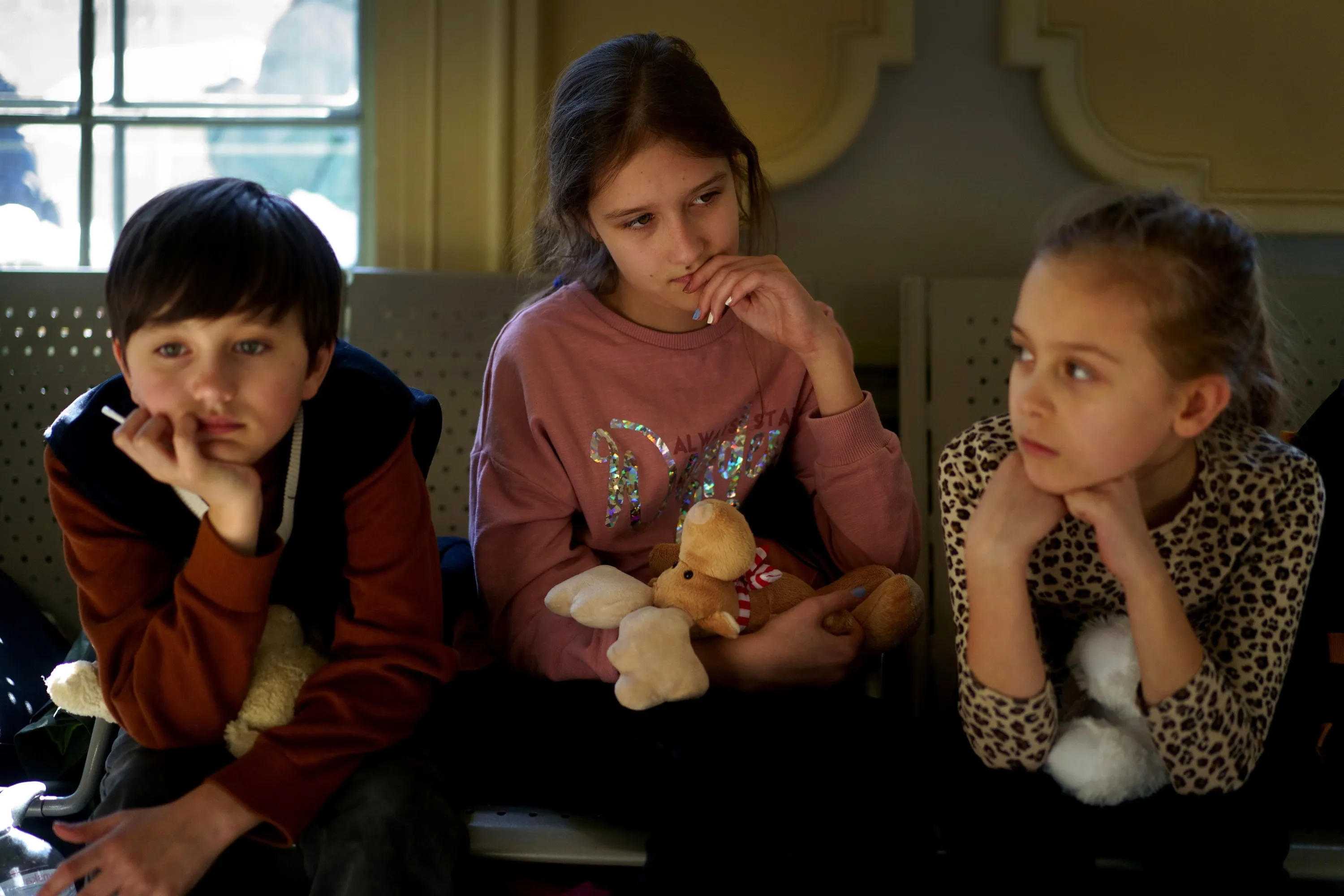 Three children from Ukraine hold soft toys as they wait with their luggage in a corridor at Przemysl train station in Poland on Saturday, March 19, 2022. (Photo by Victoria Jones/PA Wire)