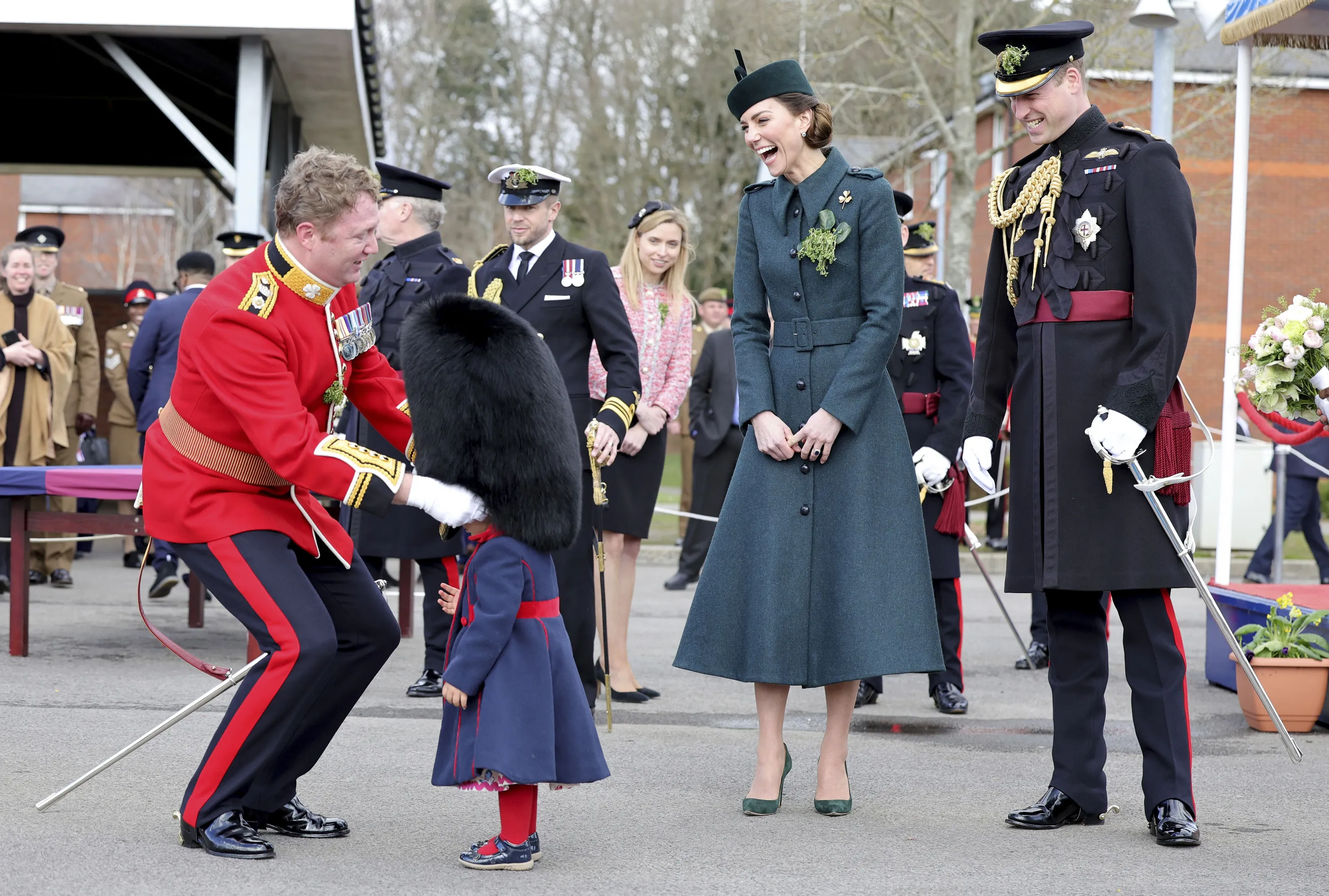 Britain's Kate, Duchess of Cambridge and Prince William laugh as Lieutenant Colonel Rob Money puts a bearskin hat on his 20-month-old daughter Gaia Money's head as they attend the 1st Battalion Irish Guards' St. Patrick's Day Parade at Mons Barracks, Thursday March 17, 2022 in Aldershot, England. (Photo by Chris Jackson, Pool via AP Photo)