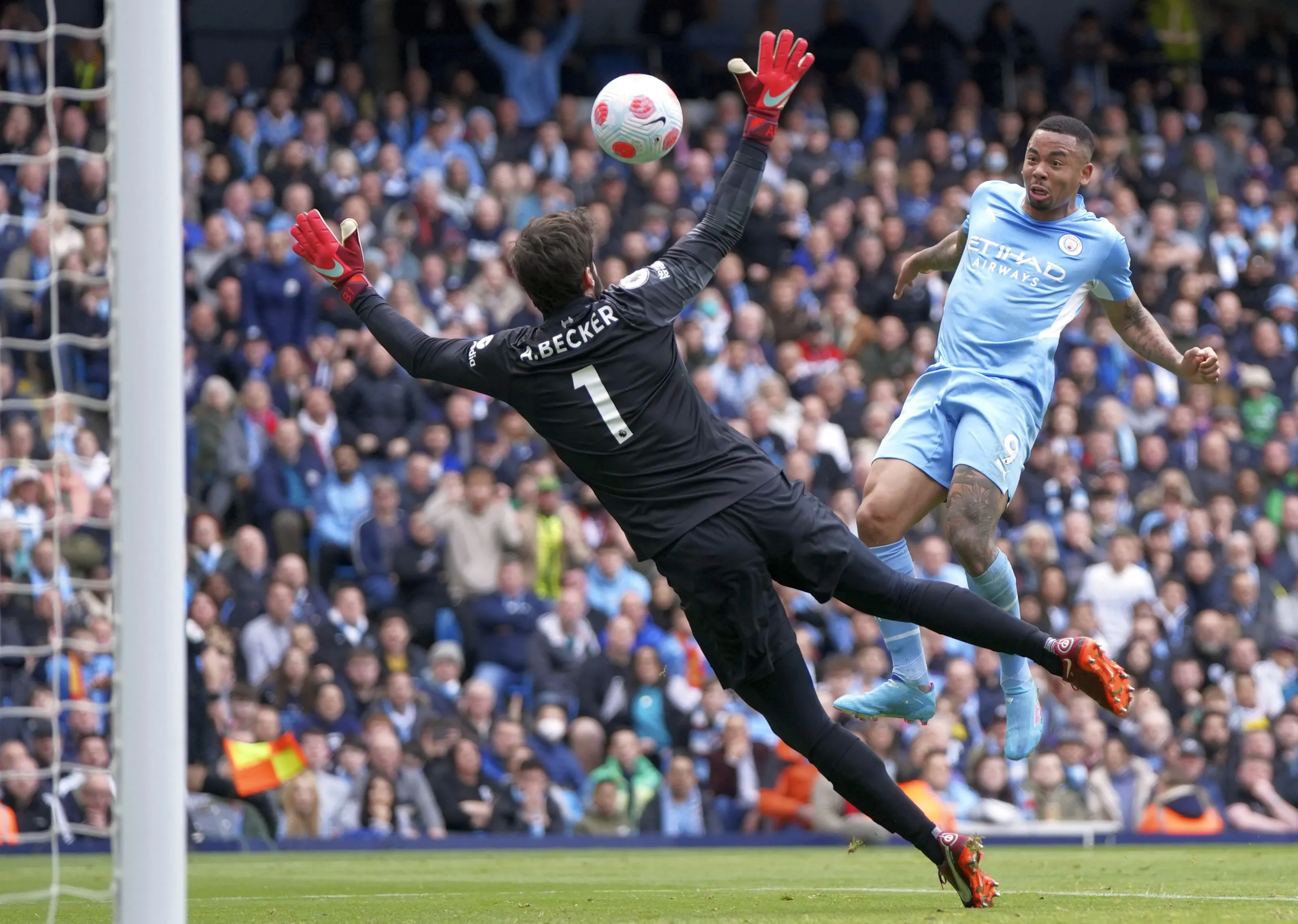 Manchester City's Gabriel Jesus, right, scores his side's second goal during the English Premier League soccer match between Manchester City and Liverpool, at the Etihad stadium in Manchester, England, Sunday, April 10, 2022. (Photo by Jon Super/AP Photo)
