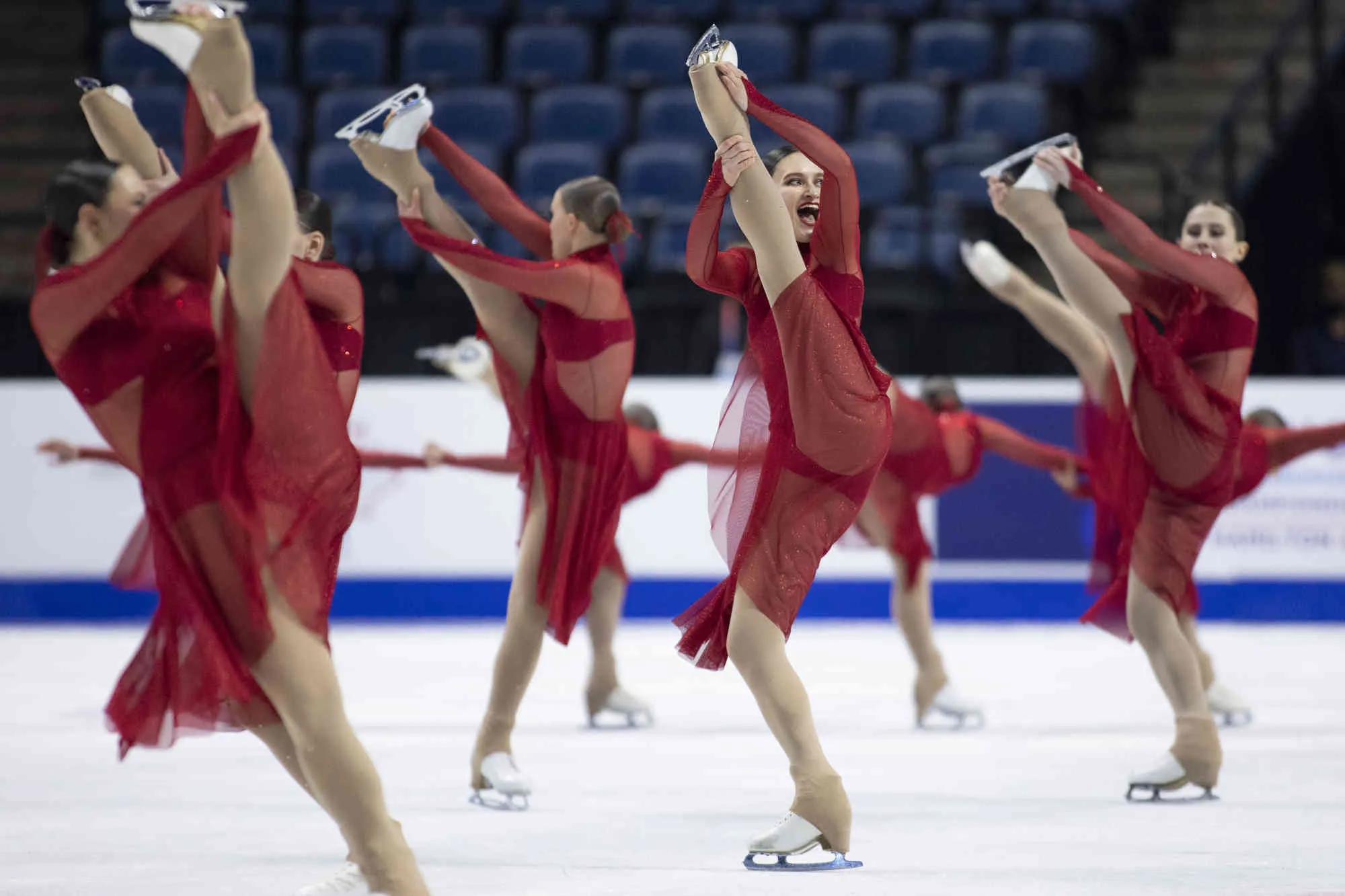Members of Team Ice Fire Senior from Poland compete in the free skate during the International Skating Union World Synchronized Skating Championships in Hamilton, Ontario, Saturday, April 9, 2022. (Photo by Nick Iwanyshyn/The Canadian Press via AP Photo)