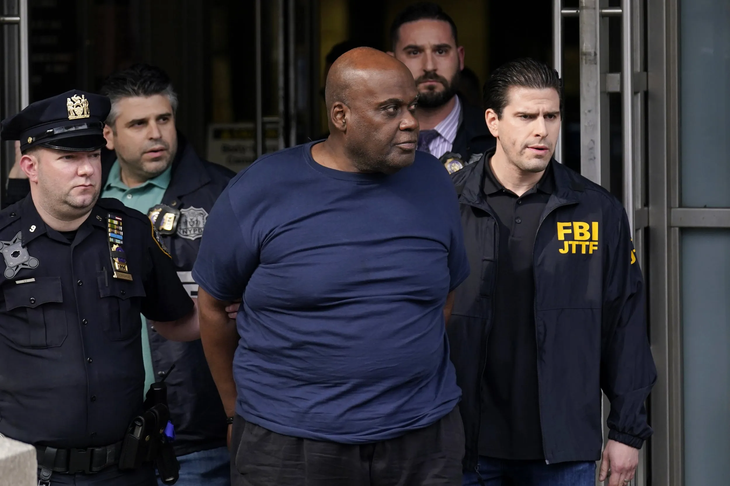 New York City Police, left, and law enforcement officials lead subway shooting suspect Frank R. James, 62, center, away from a police station, in New York, Wednesday, April 13, 2022. The man accused of shooting multiple people on a Brooklyn subway train was arrested Wednesday and charged with a federal terrorism offense. (Photo by Seth Wenig/AP Photo)
