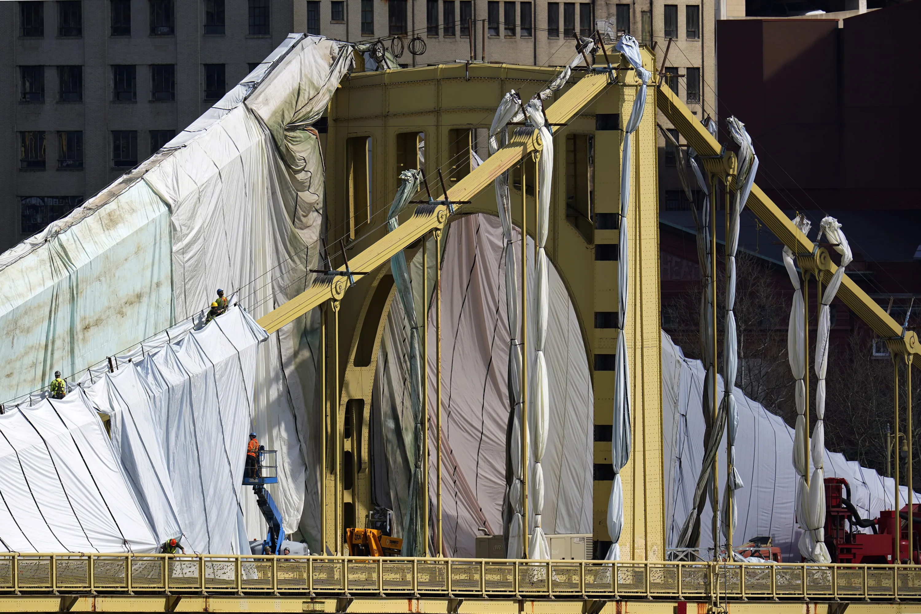 Workers prepare the Roberto Clemente bridge for refurbishing in downtown Pittsburgh on Tuesday, April 12, 2022. The project is expected to be completed by Dec. 2023. (Photo by Gene J. Puskar/AP Photo)
