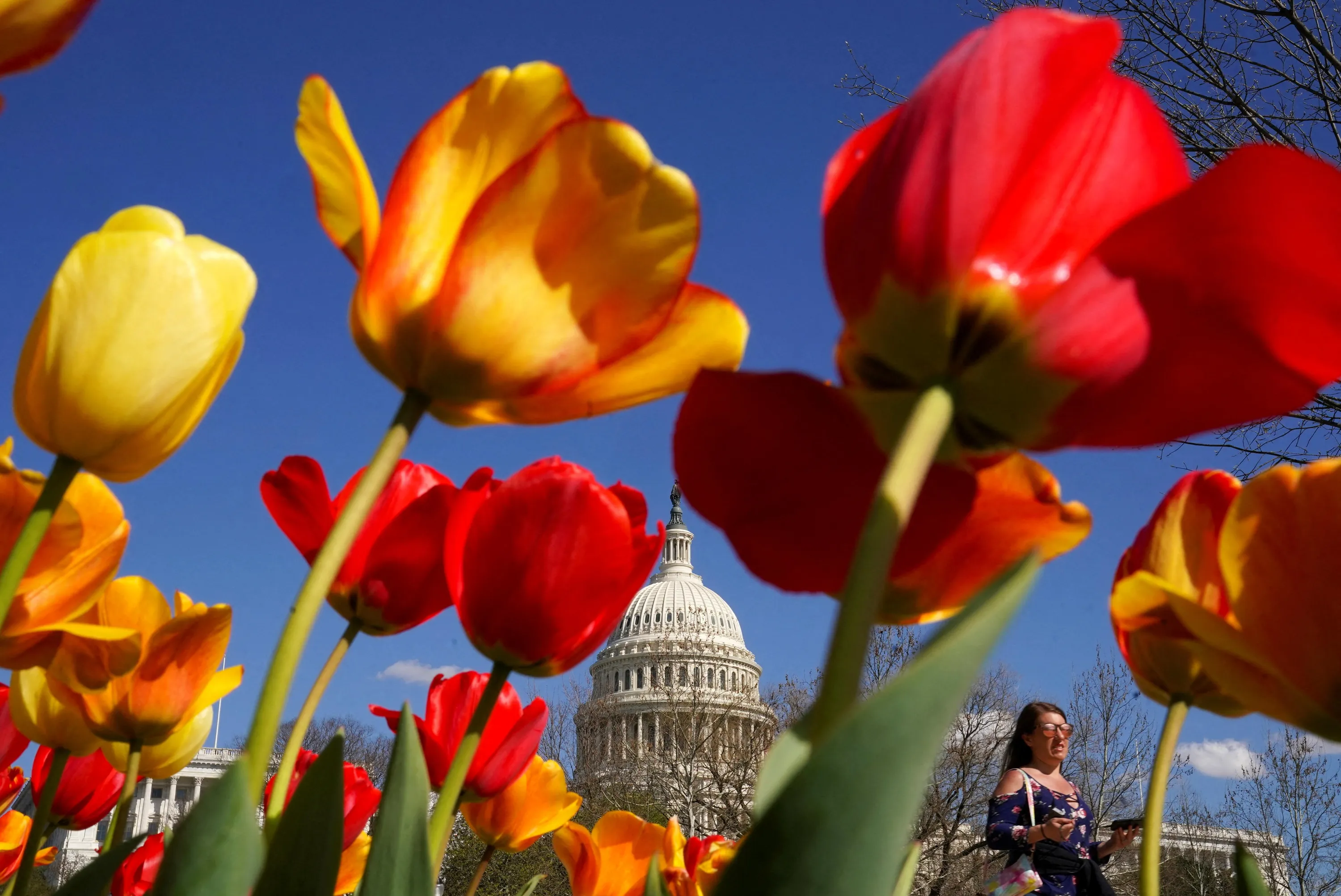 The dome of the U.S. Capitol is seen through a tulip garden as a woman strolls the grounds on a warm spring day in Washington, U.S., April 12, 2022. (Photo by Kevin Lamarque/Reuters)