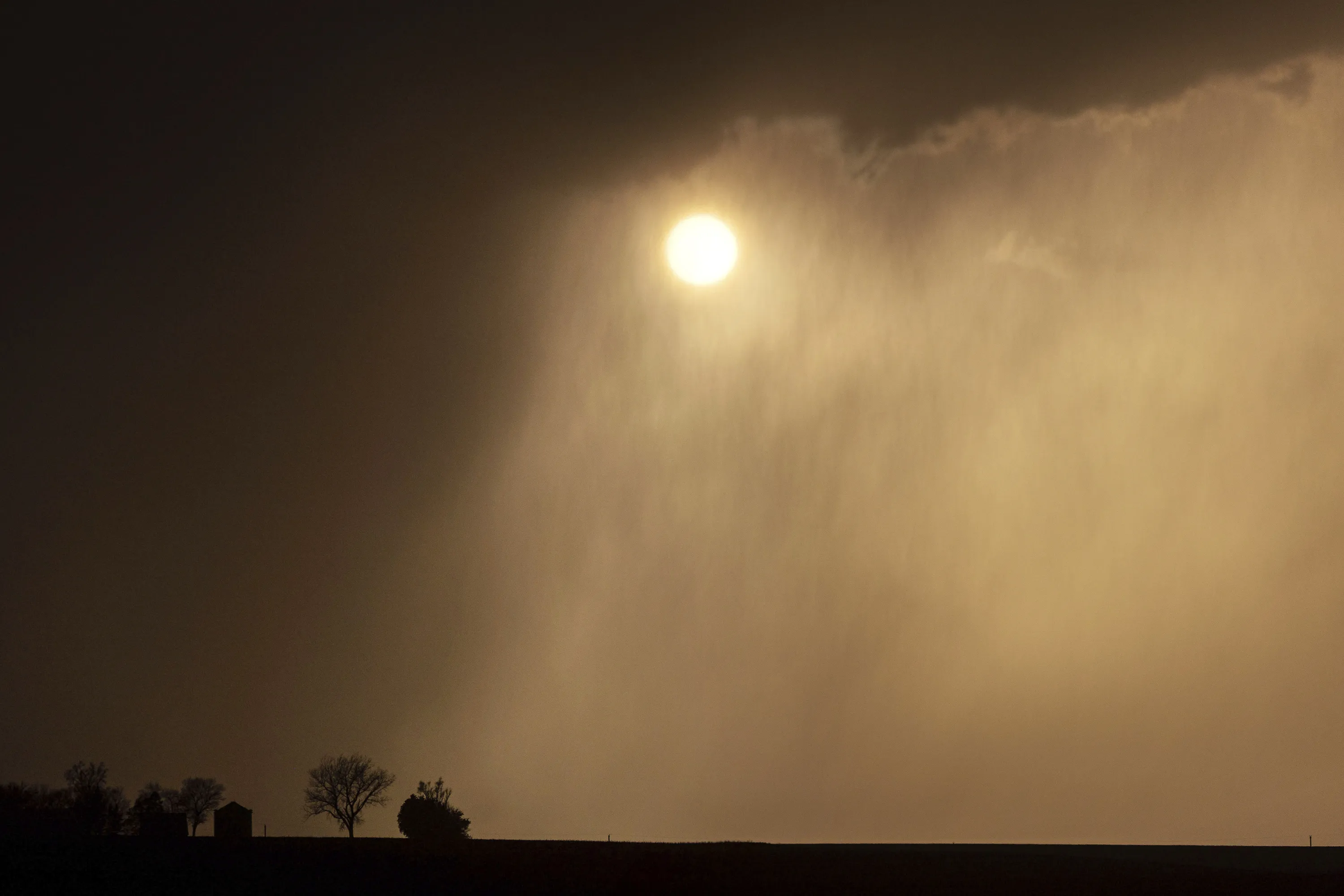 Storms approach Blair, Neb., looking west on State Highway 91 as the sun starts to set on Tuesday, April 12, 2022. (Photo by Chris Machian/Omaha World-Herald via AP Photo)