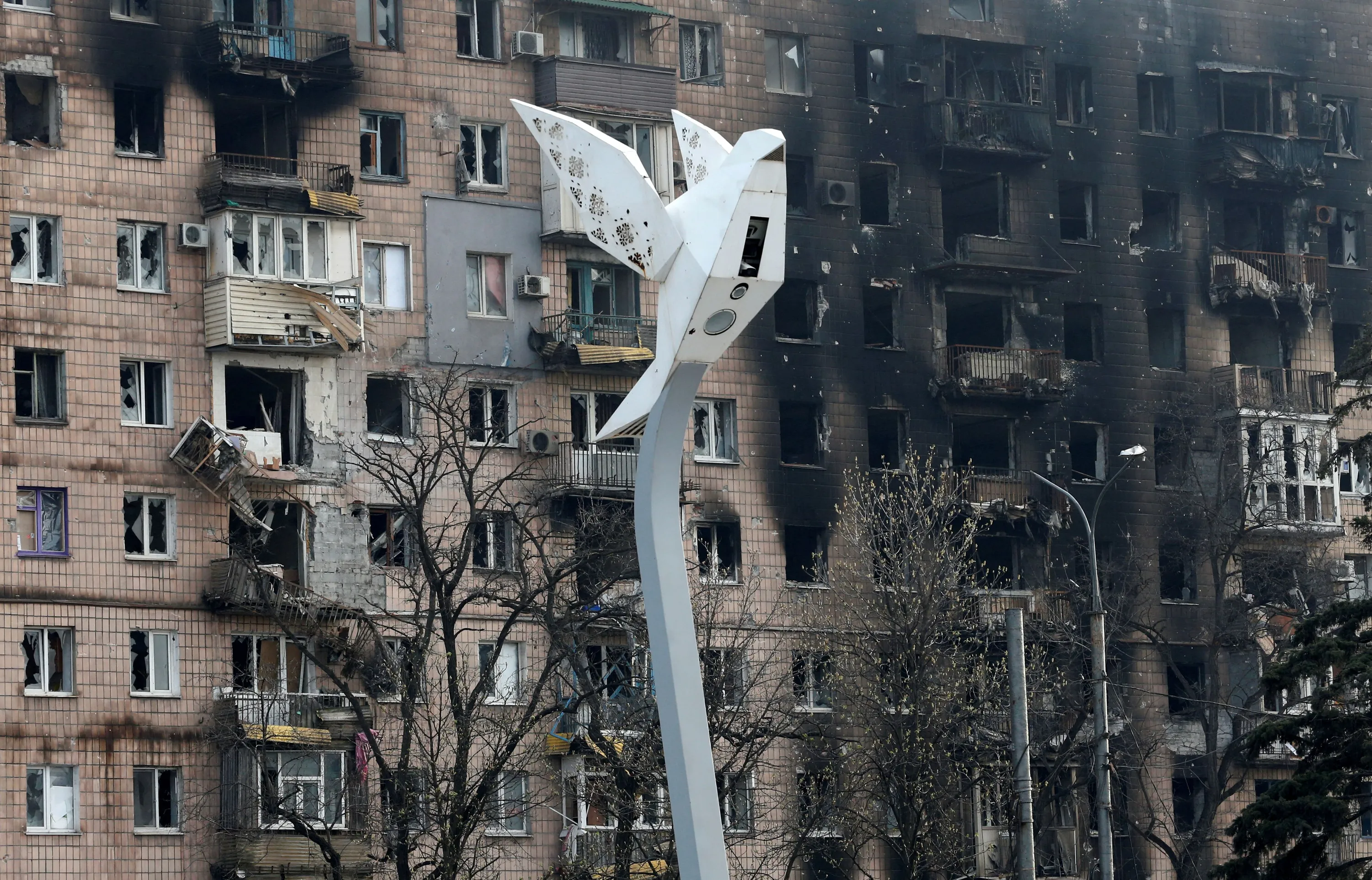 A view shows a lamp pole in the shape of a dove located in Freedom Square near a block of flats heavily damaged during Ukraine-Russia conflict in the southern port city of Mariupol, Ukraine on April 18, 2022. (Photo by Alexander Ermochenko/Reuters)