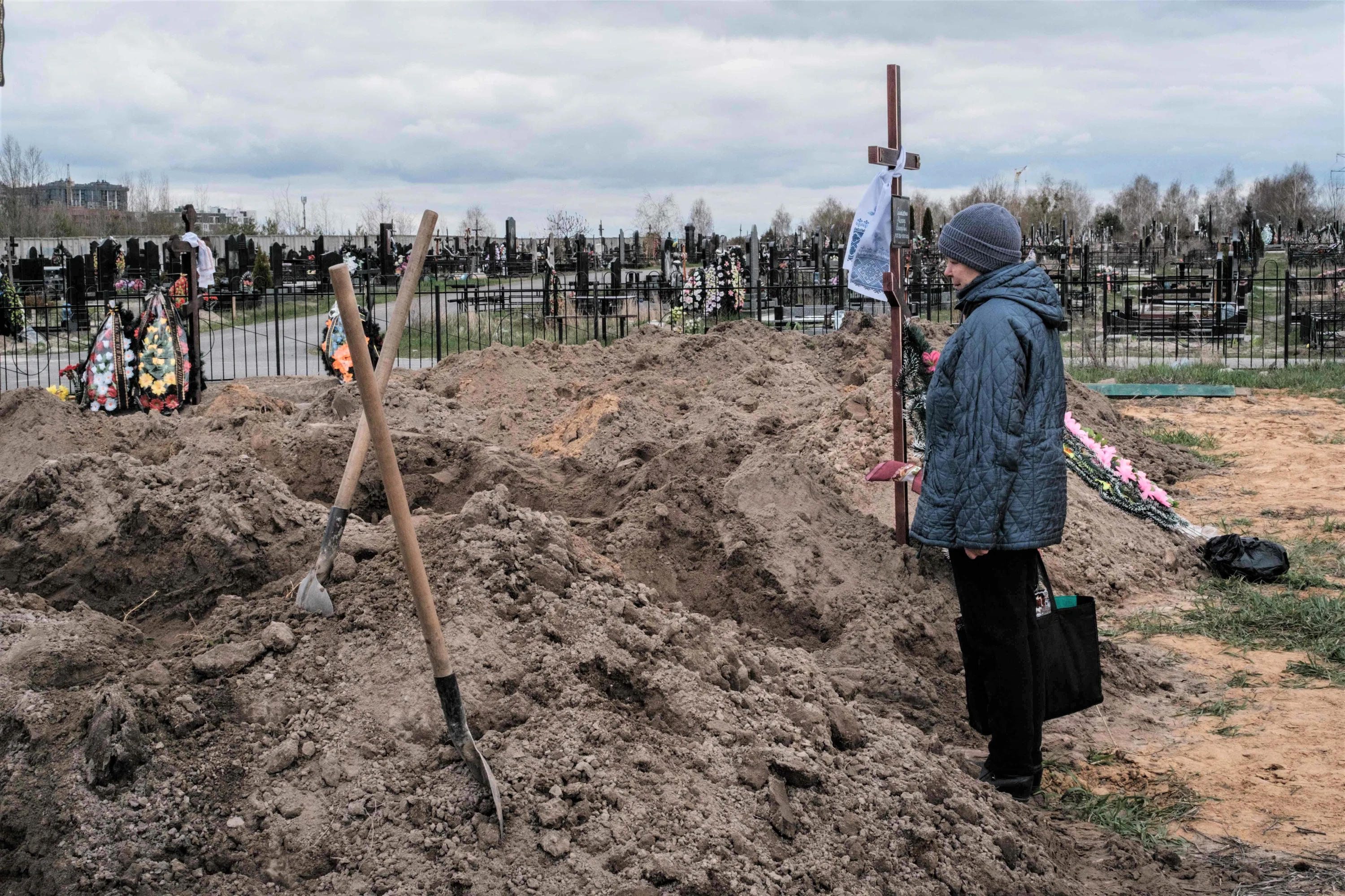Nadia looks at the coffin of her husband who was killed, after the funeral at a cemetery in Bucha, on April 18, 2022, during the Russian invasion of Ukraine. (Photo by Yasuyoshi Chiba/AFP Photo)