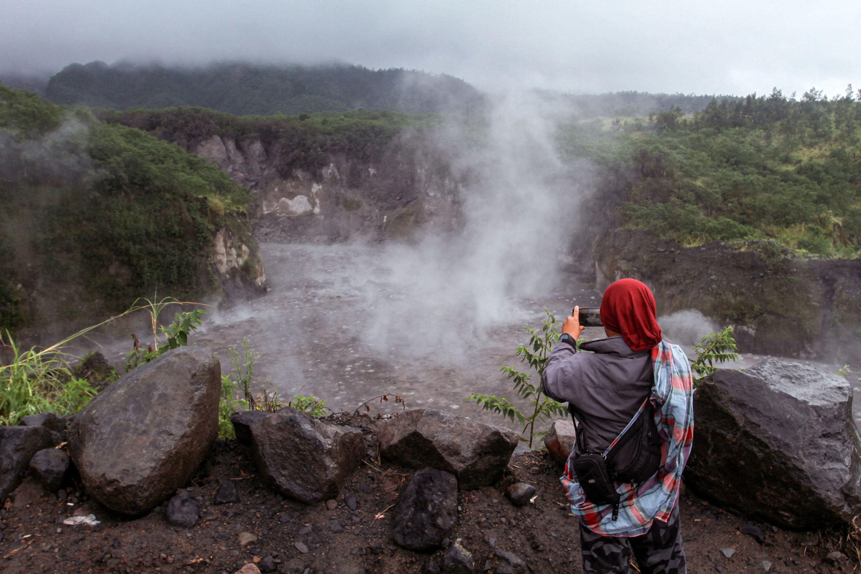 A resident takes photos after lava flowed from Indonesia's most active volcano Mount Merapi, seen from the village of Umbulharjo in Sleman, outside Yogyakarta, on March 10, 2022. (Photo by Devi Rahman/AFP Photo)
