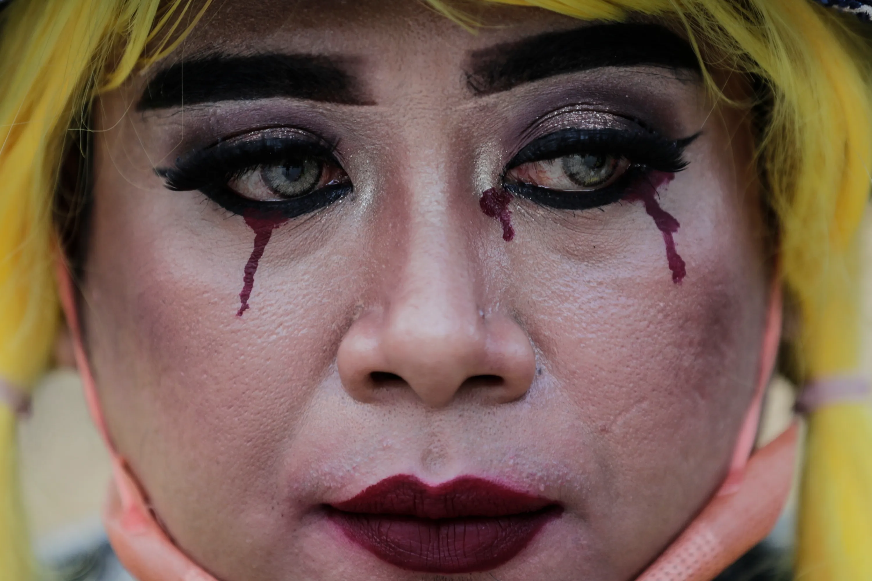 An environmental activist with blood tear make-ups takes part on a rally against climate change in Jakarta, Indonesia, 25 March 2022. Dozens of activists staged a rally demanding the government to take necessary actions to fight climate change. (Photo by Mast Irham/EPA/EFE)