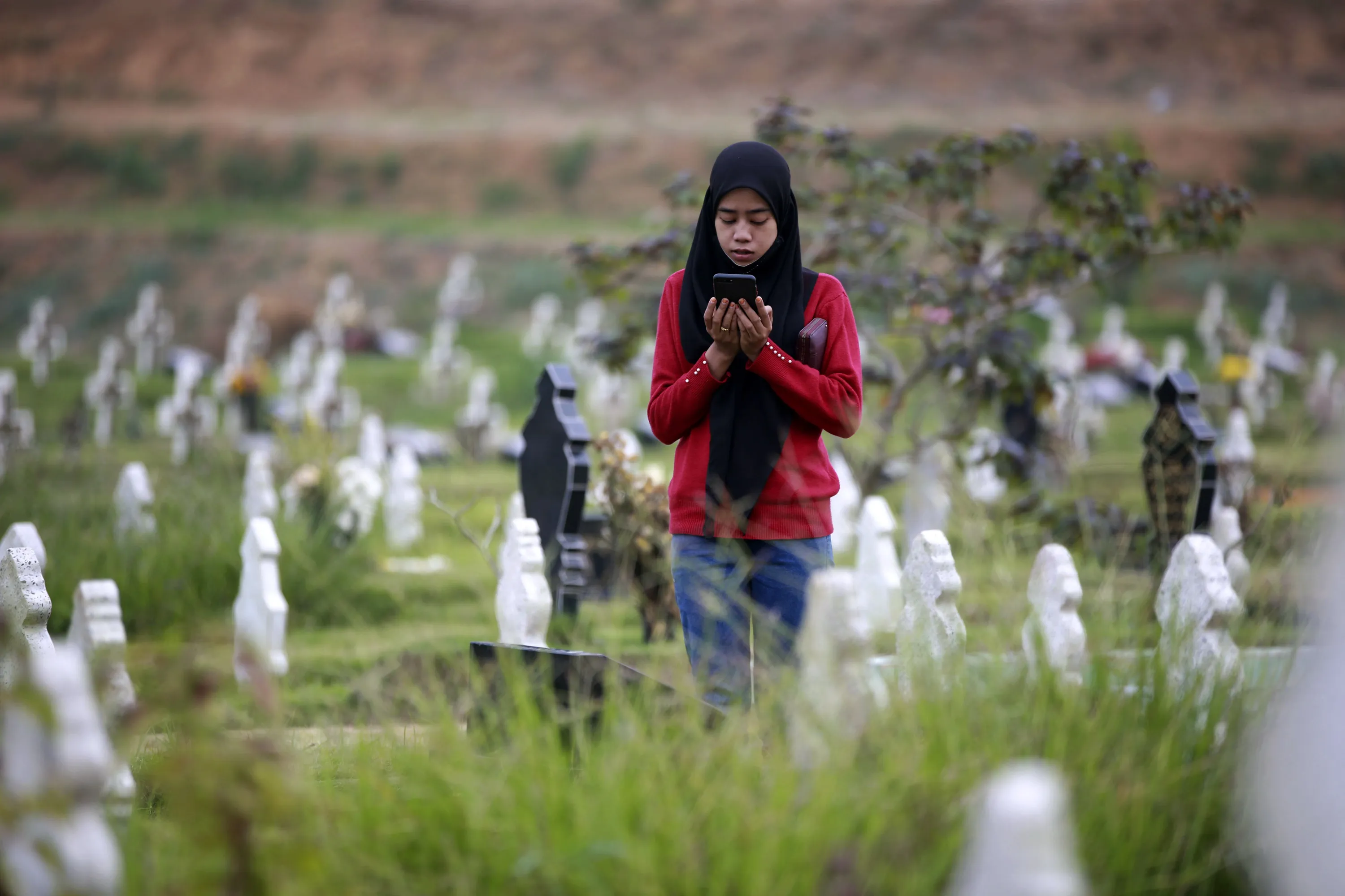 A Muslim woman prays at the grave of a relative at a cemetery reserved for those who died of COVID-19, in Medan, North Sumatra, Indonesia, Thursday, March 31, 2022. Prior to the holy fasting month of Ramadan that is expected to begin on Sunday, Muslims followed local tradition to visit cemeteries to pray for their deceased loved ones. (Photo by Binsar Bakkara/AP Photo)