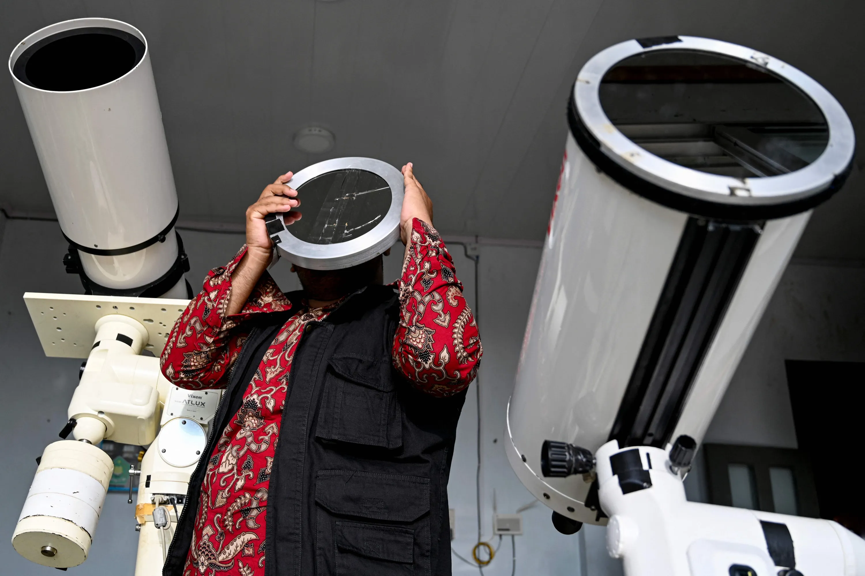 An observatory officer checks a telescope before looking for the moon to mark the start of Islam's holy month of Ramadan at Lhoknga beach in Aceh province on April 1, 2022. (Photo by Chaideer Mahyuddin/AFP Photo)