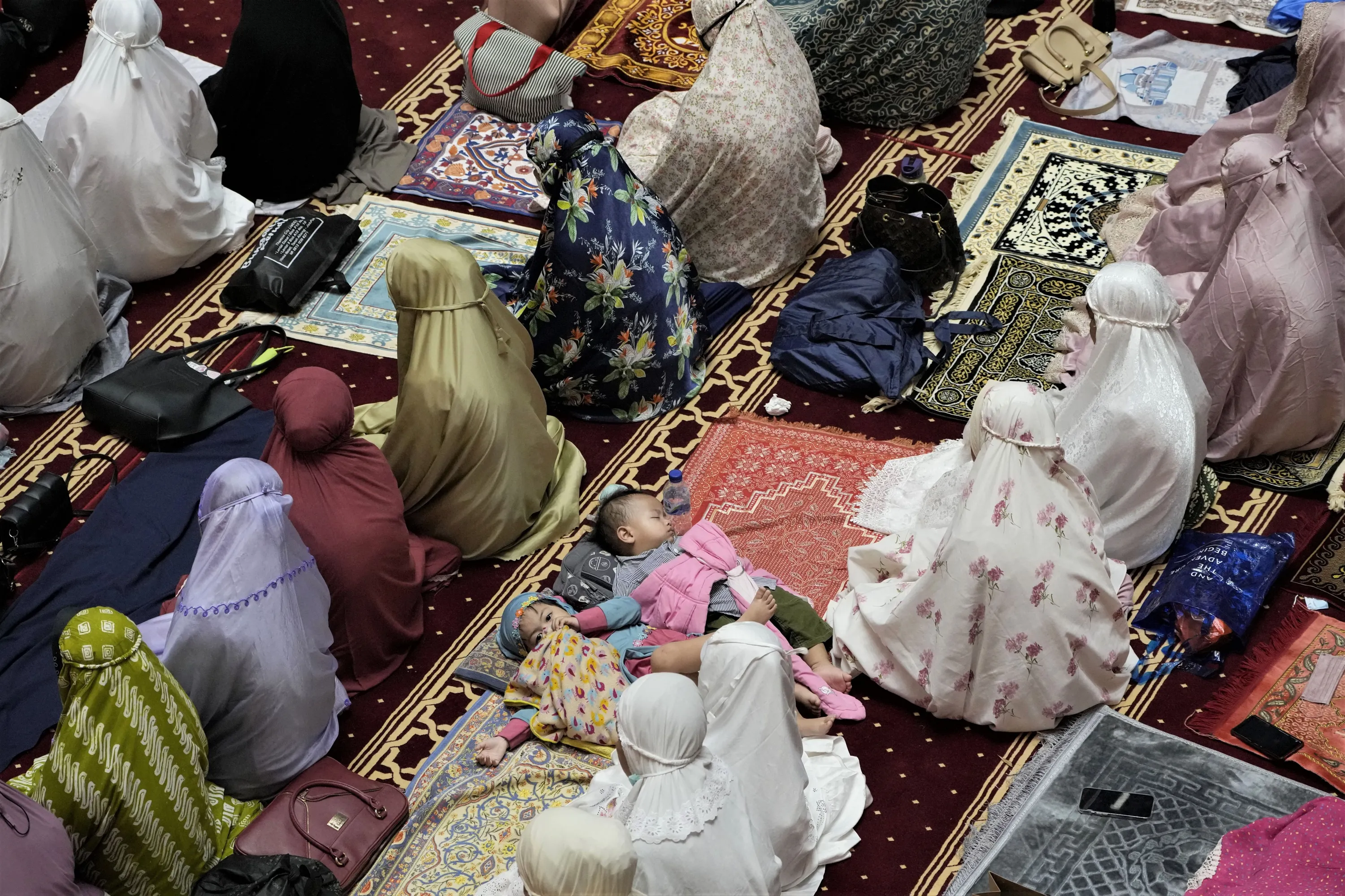 Children sleep as Muslim women perform an evening prayer called “tarawih” that marks the first eve of the holy fasting month of Ramadan at Istiqlal Mosque in Jakarta, Indonesia, Saturday, April 2, 2022. During Ramadan Muslims refrain from eating, drinking, smoking and sex from dawn to dusk. (Photo by Dita Alangkara/AP Photo)