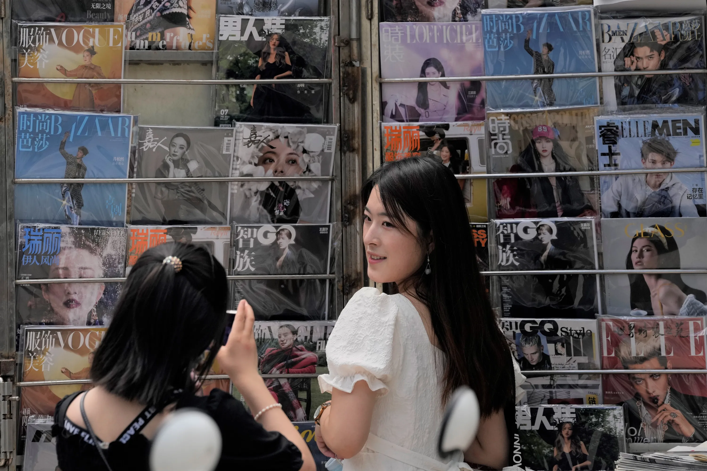 A woman poses for a photo near magazines showing celebrities at a newsstand in Beijing on August 1, 2021. Hugely popular online games and celebrity culture are the latest targets in the ruling Communist Party's campaign to encourage China's public to align their lives with its political and economic goals. (Photo by Ng Han Guan/AP Photo)