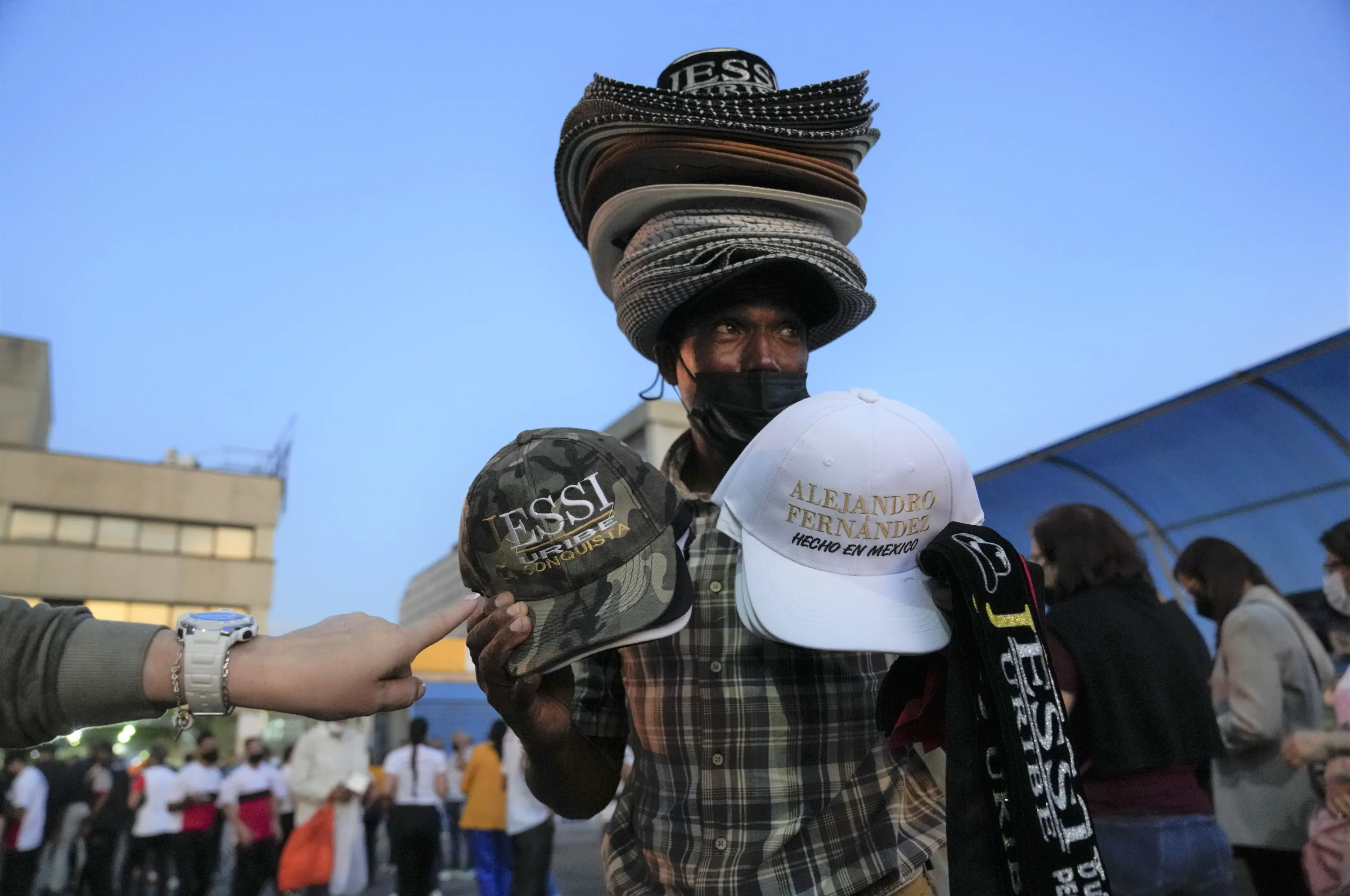 A man sells hats with the name of Mexican singer Alejandro Fernandez and Colombian singer Jessi Uribe as people line up to get into the concert in Caracas, Venezuela, March 3, 2022. (Photo by Ariana Cubillos/AP Photo)