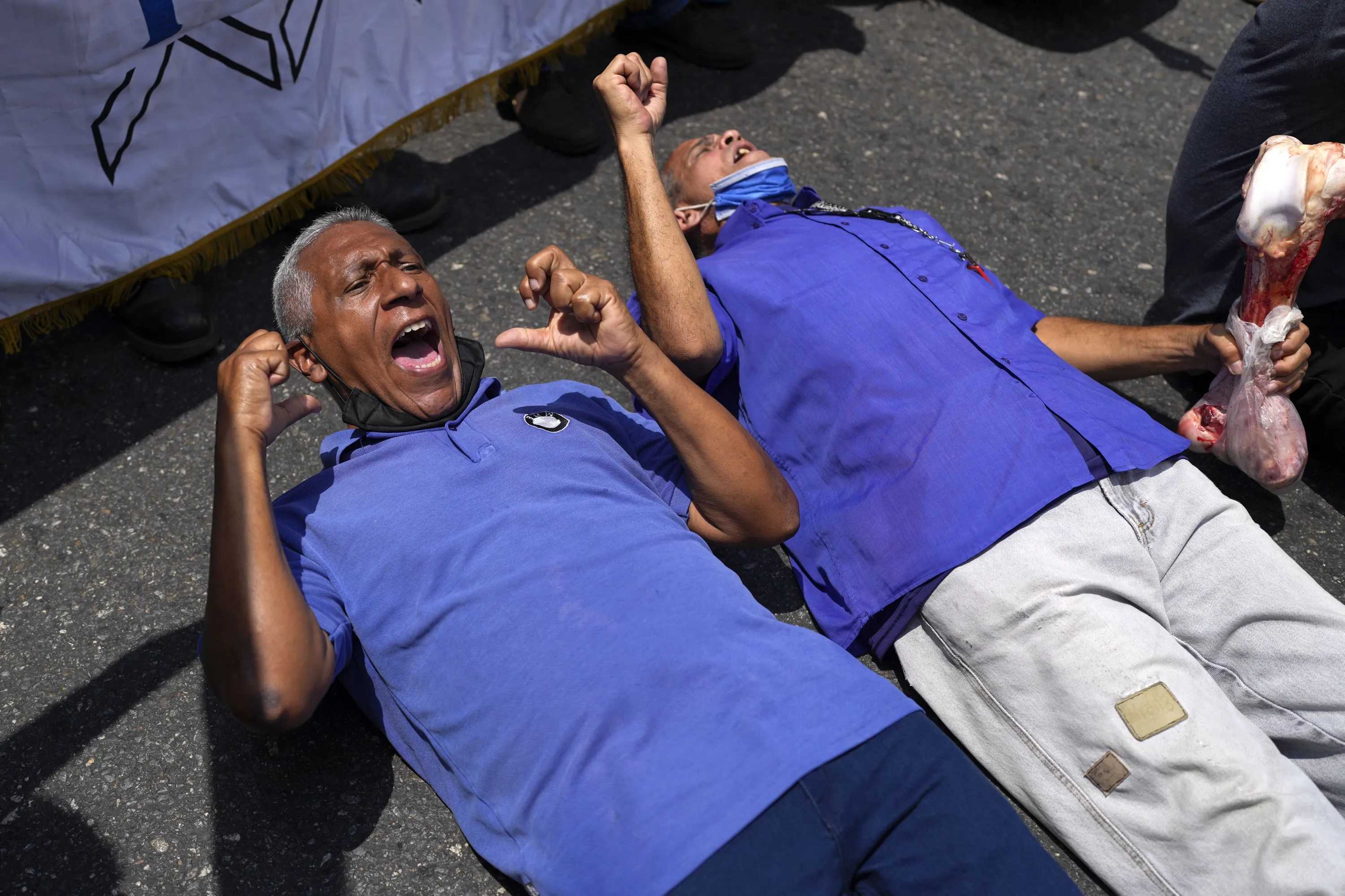 People lie down on a street as they scream demanding better salaries for workers, pensioners and retirees, during a protest in Caracas, Venezuela, Wednesday, April 6, 2022. (Photo by Ariana Cubillos/AP Photo)
