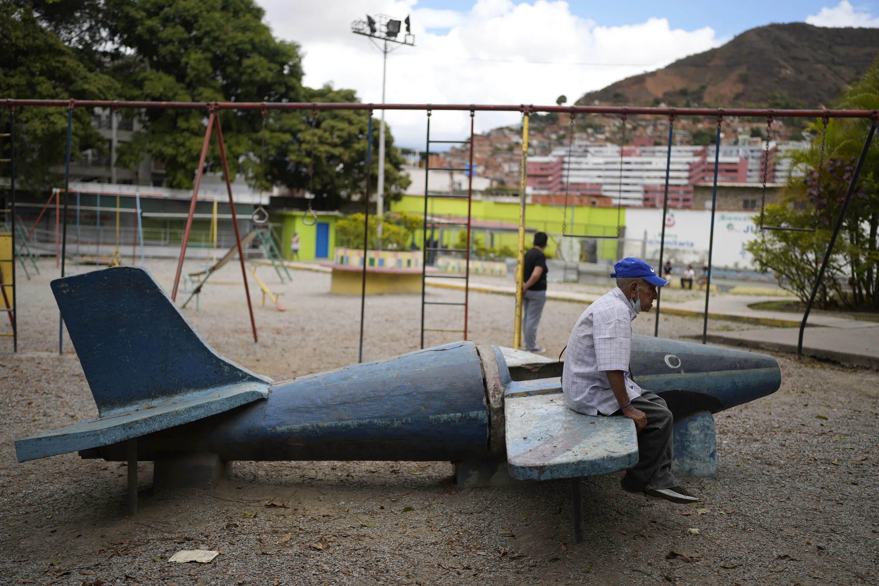 An elderly man sits on a plane made of cement at a park near a soup kitchen as he waits to pick up his free lunch in Caracas, Venezuela, Friday, March 11, 2022. Venezuela has just over five million pensioners, according to official figures, but annual inflation which reached 686.4% last year has eaten up their pensions. (Photo by Ariana Cubillos/AP Photo)