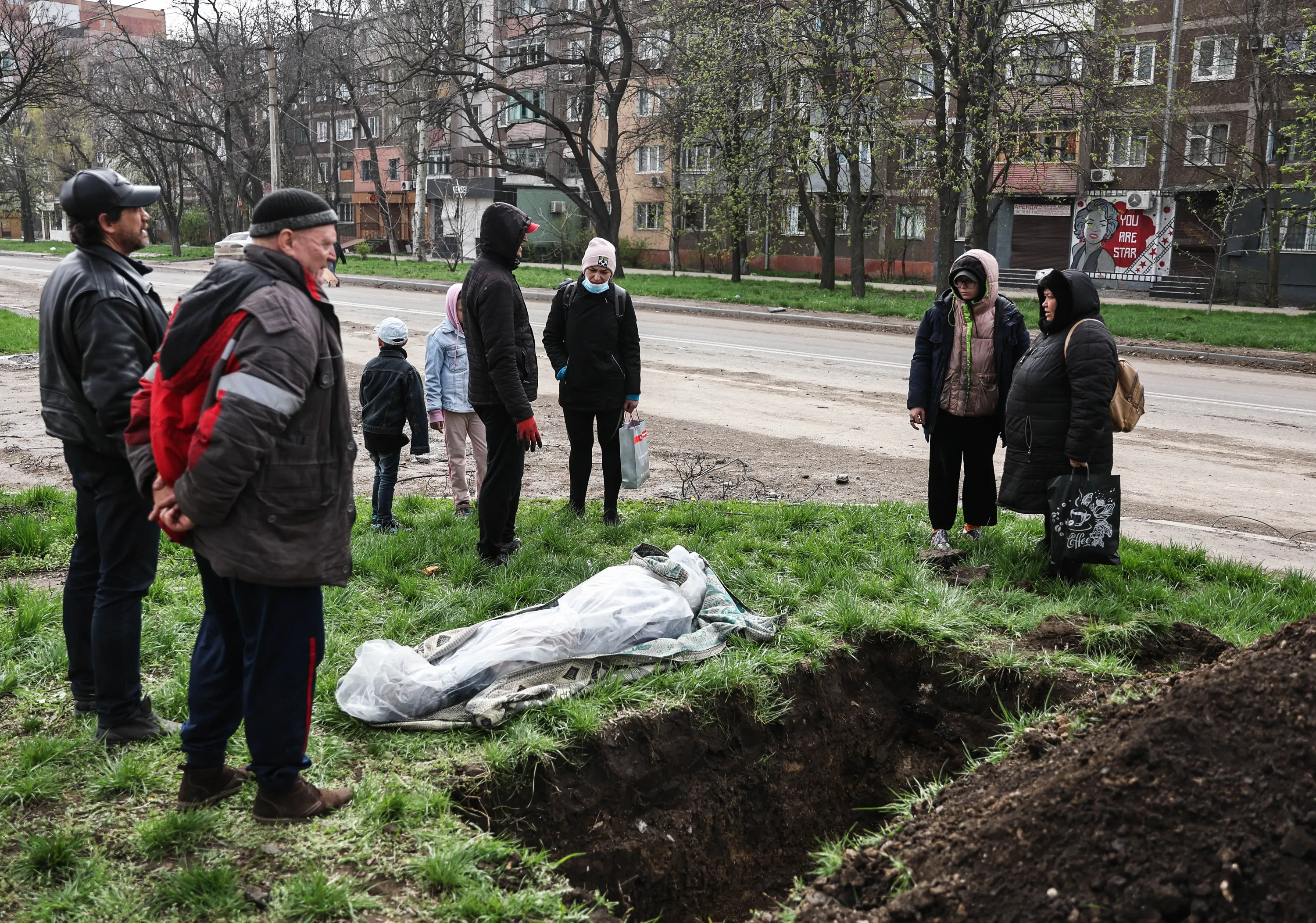 A funeral of a local resident is held in a street in Mariupol, Donetsk Region, Ukraine on April 19, 2022. The Russian Armed Forces are carrying out a special military operation in Ukraine. (Photo by Sergei Bobylev/TASS)