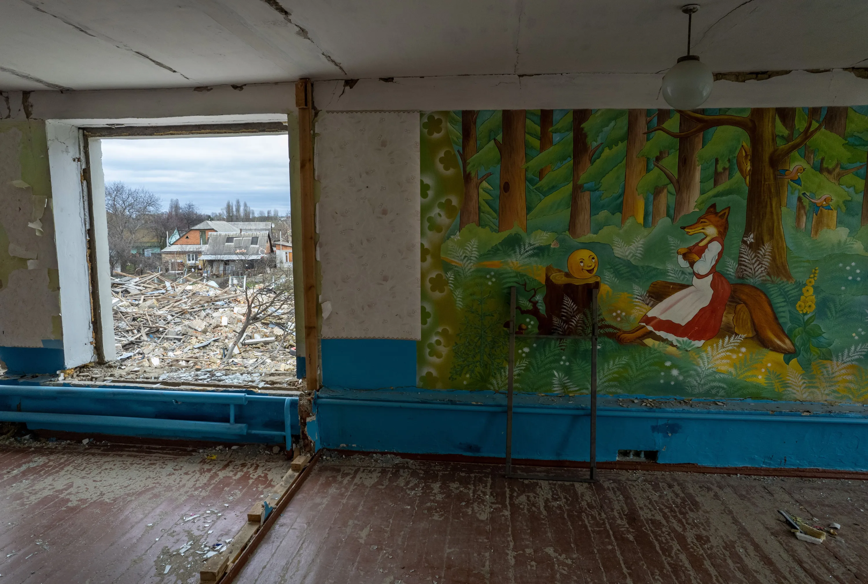 A room in a kindergarten stands windowless after the school was bombed during the Russian invasion west of Kyiv on April 19, 2022 in Makarov, Ukraine. Neighbors said a single bomb struck the Barvinok school at 5am on March 7th as Russian forces attacked Makarov, west of Kyiv, destroying much of the structure. No one was reported killed in the blast. Local residents cleaned up the interior, pending reconstruction of the facility. (Photo by John Moore/Getty Images)