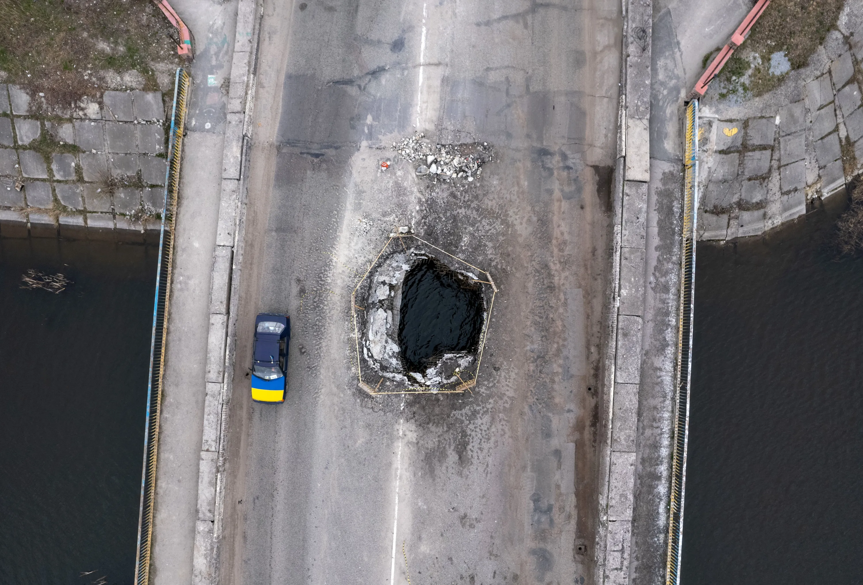 A vehicle draped with a Ukrainian flag passes over a war damaged bridge on April 19, 2022 in Makarov, Ukraine. The bridge was damaged in early March during the Russian attack on the town. (Photo by John Moore/Getty Images)