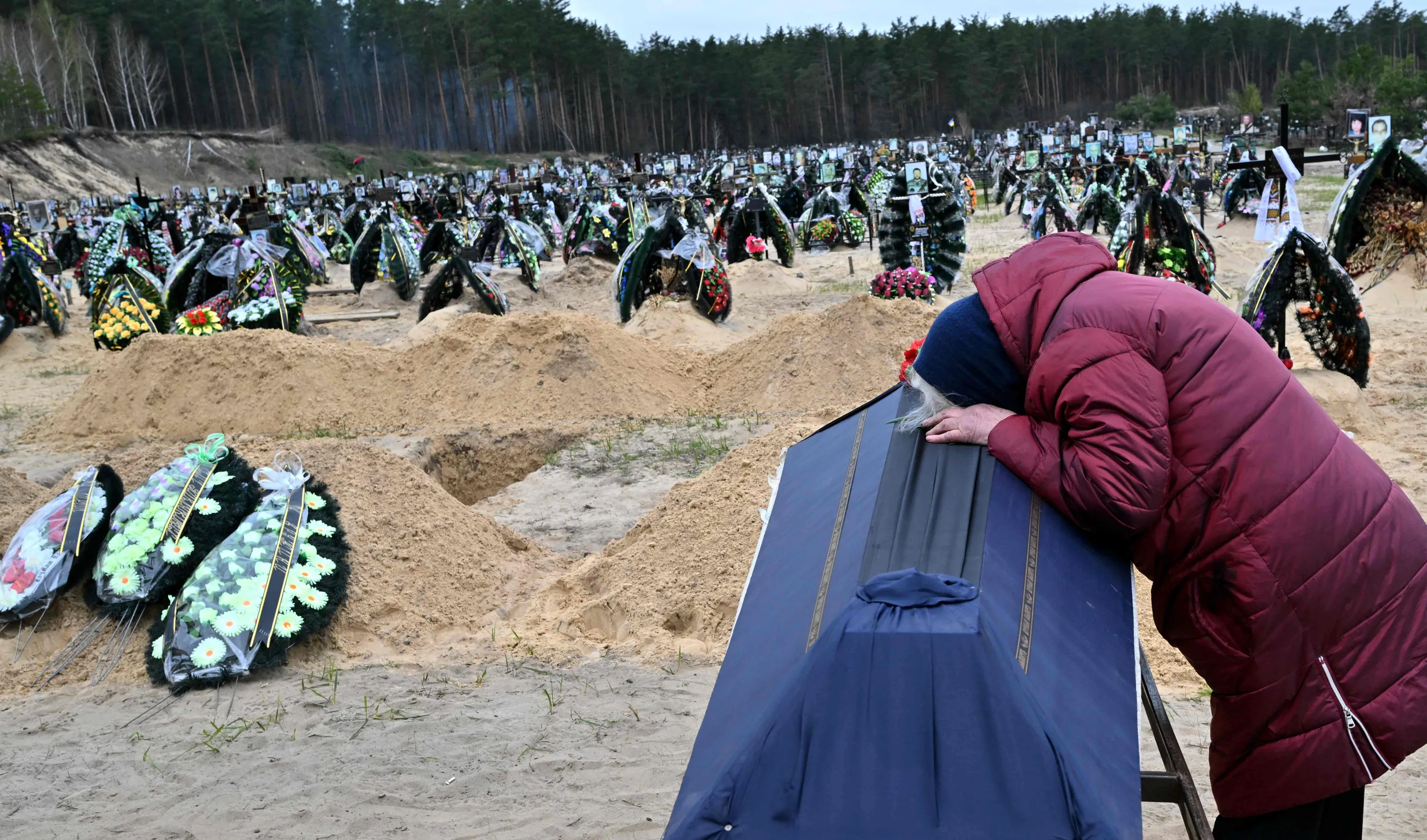 A woman reacts next to the coffin of her husband during a funeral at a cemetery in Irpin on April 19, 2022, where there are at least three rows of new graves for those killed during the Russian invasion of Ukraine. (Photo by Sergei Supinsky/AFP Photo)