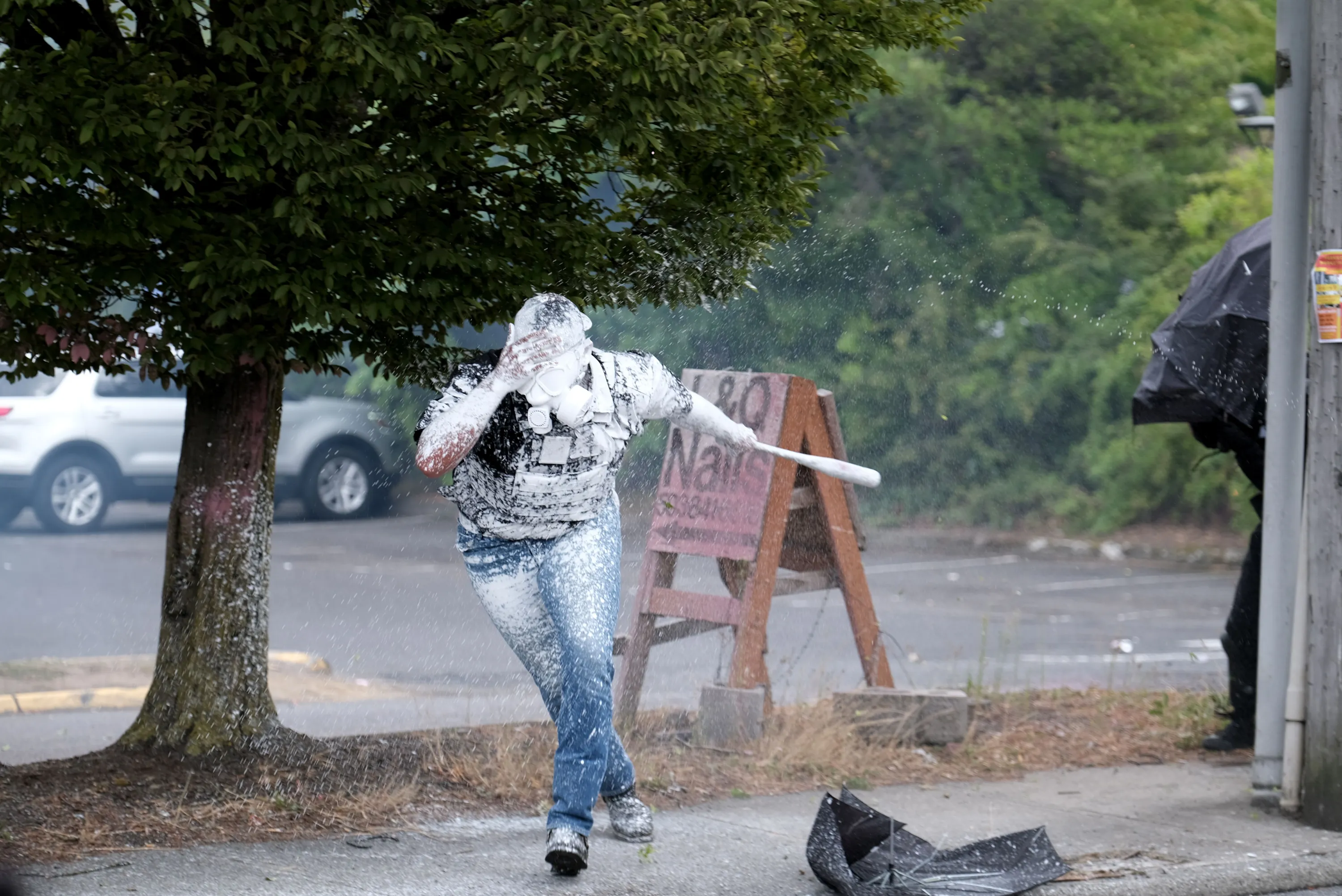Tusitala “Tiny” Toese, a member of the far-right group Proud Boys, retreats after getting covered in paint by anti-fascist protesters during clashes between the politically opposed groups on Sunday, August 22, 2021, in Portland, Ore. (Photo by Alex Milan Tracy/AP Photo)