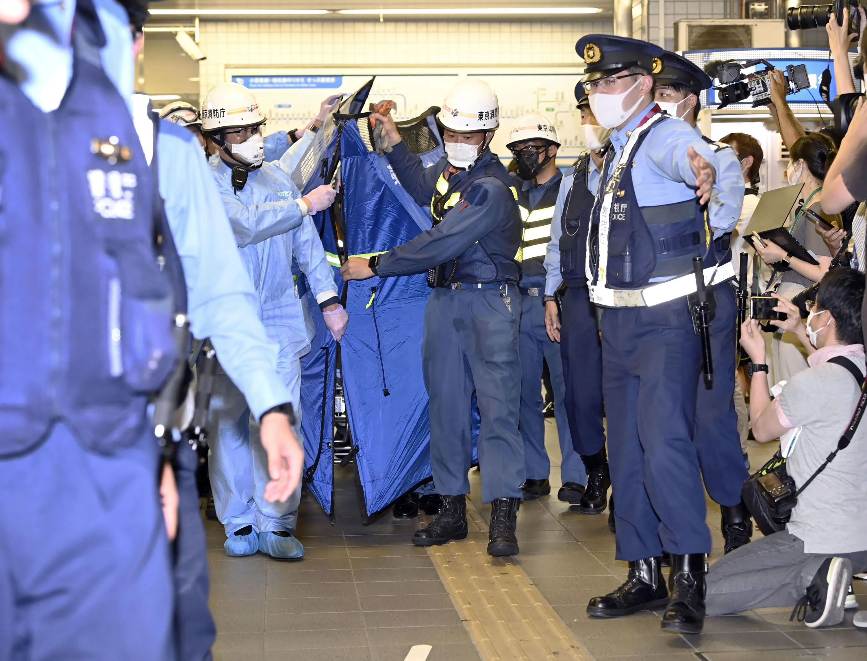 Rescuers carry a stretcher, believed to be carrying an injured passenger at Soshigaya Okura Station after stabbing on a commuter train, in Tokyo Friday night, August 6, 2021. A man with a knife attacked 10 passengers on a commuter train in Tokyo on Friday and was arrested by police after fleeing, fire department officials and news reports said. (Photo by Kyodo News via AP Photo)