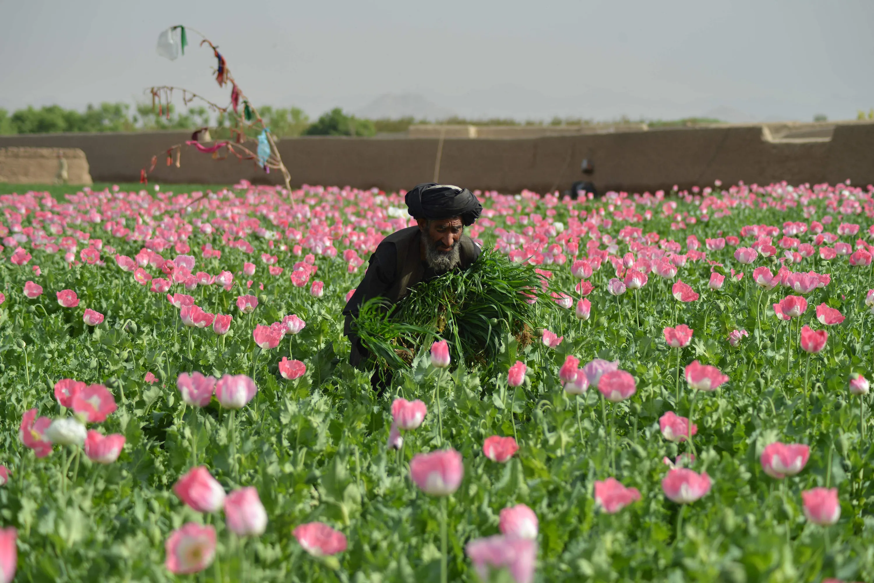 A farmer works at a poppy field in the Zhari district of Kandahar on March 14, 2022. (Photo by Javed Tanveer/AFP Photo)