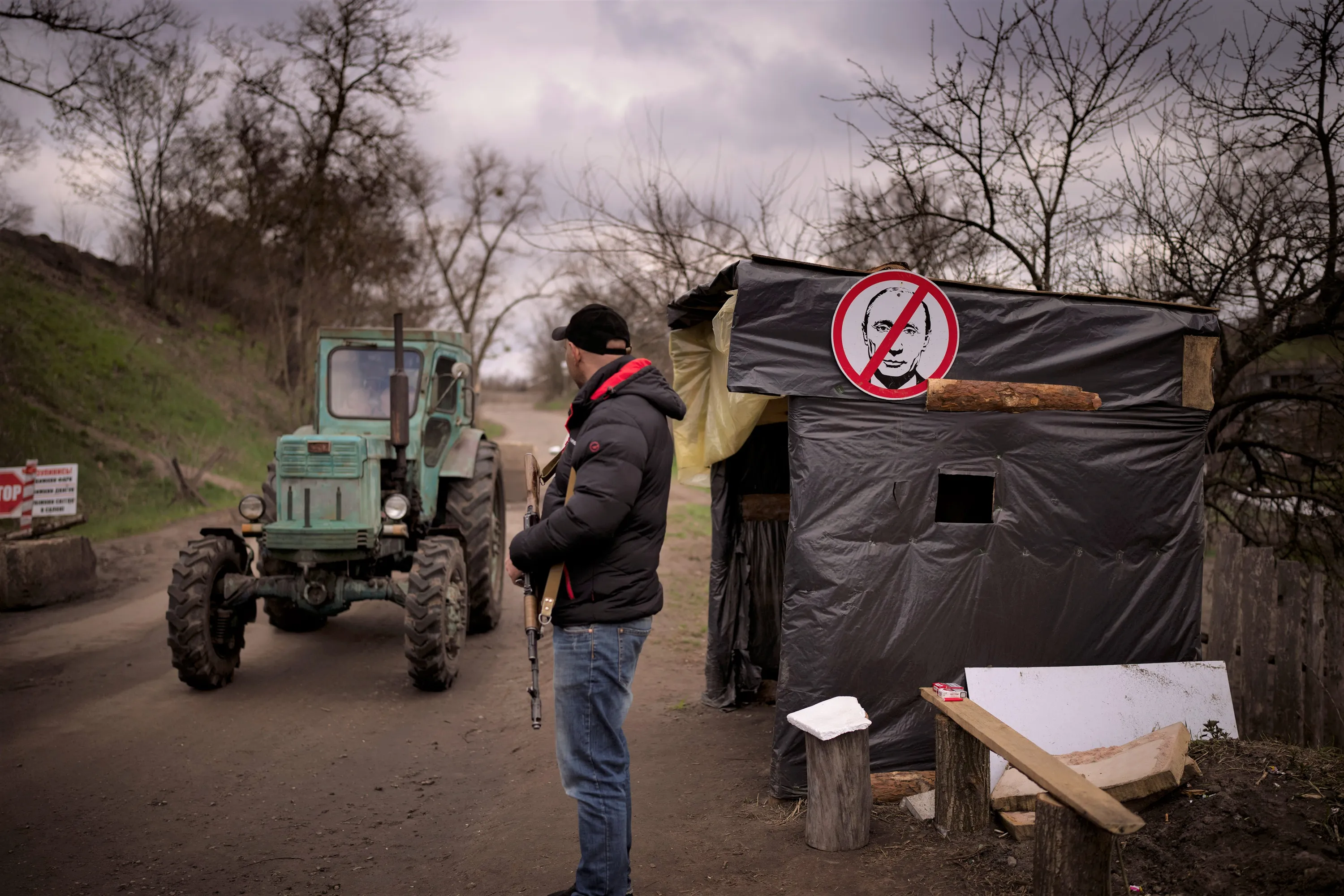 A civil defence volunteer stands guard at a checkpoint controlling the traffic near Kyiv, Ukraine on Thursday, April 21, 2022. (Photo by Emilio Morenatti/AP Photo)