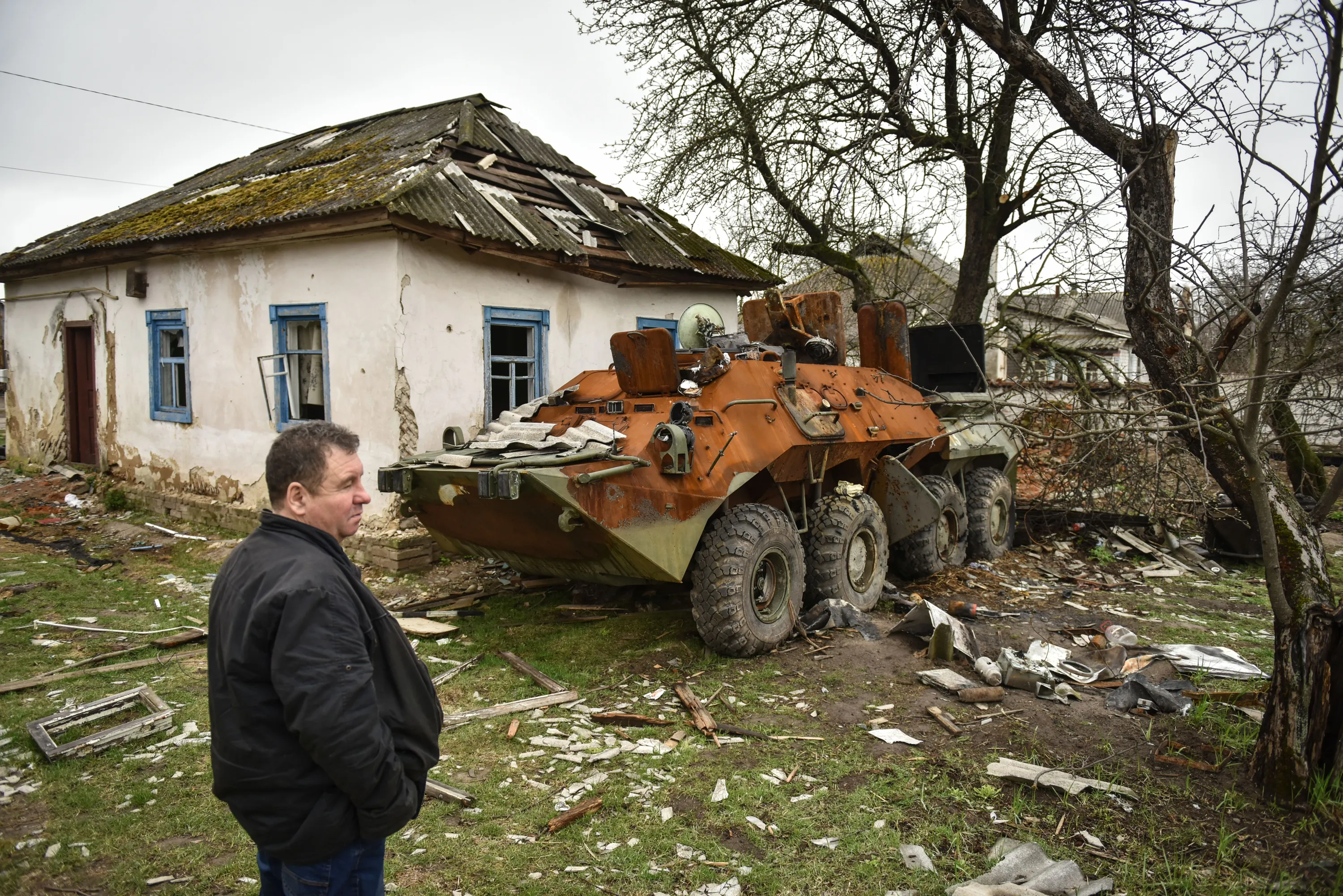 A man observes a burned APC in Yahidne village, Chernihiv region, Ukraine, 19 April 2022 (made available 20 April). On 24 February Russian troops had entered Ukrainian territory resulting in fighting and destruction in the country, a huge flow of refugees, and multiple sanctions against Russia. (Photo by Oleg Petrasyuk/EPA/EFE)