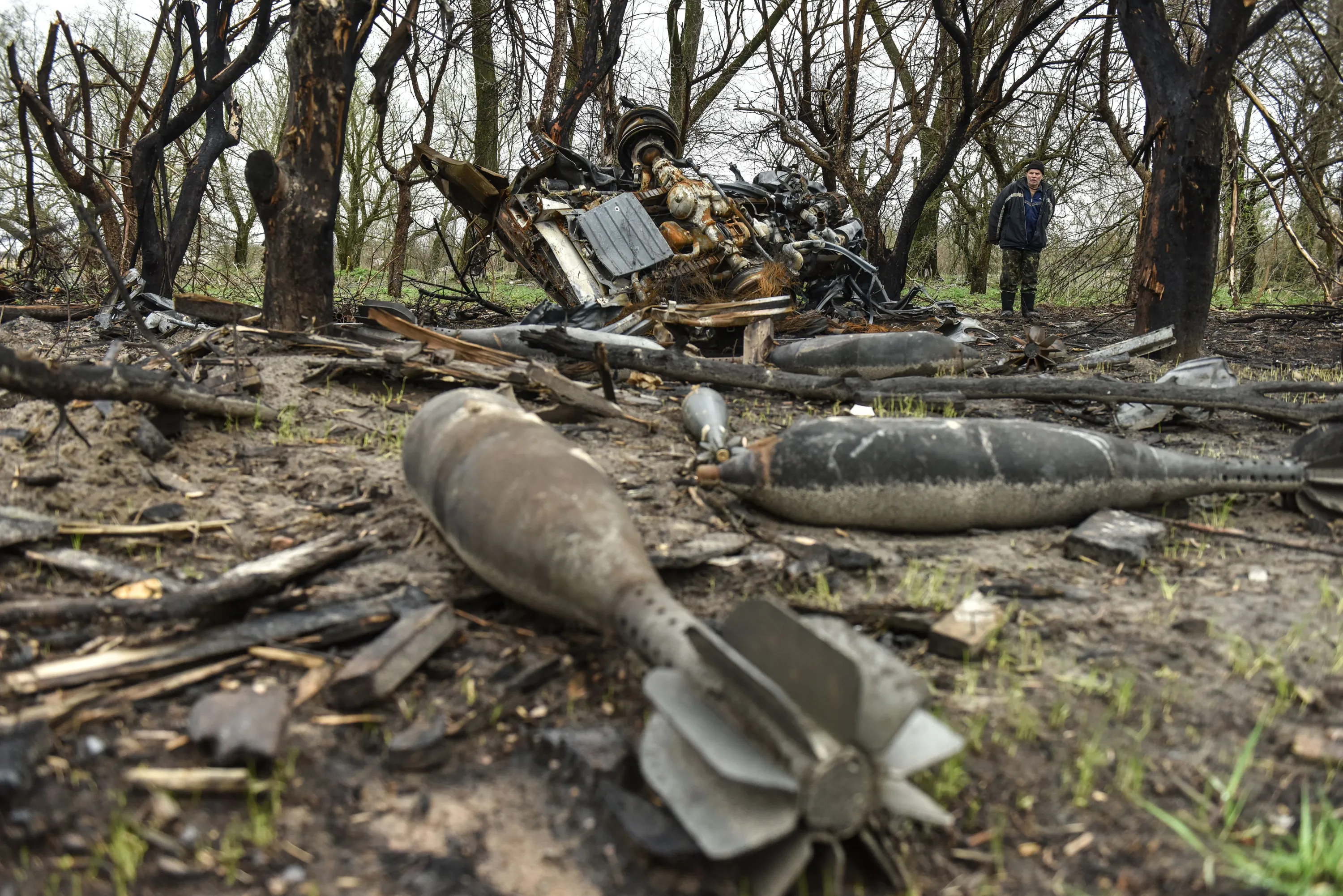 A local man looks at rest of bombs that litters a field in Ivanivka village, Chernihiv region, UKraine, 20 April 2022. (Photo by Oleg Petrasyuk/EPA/EFE)