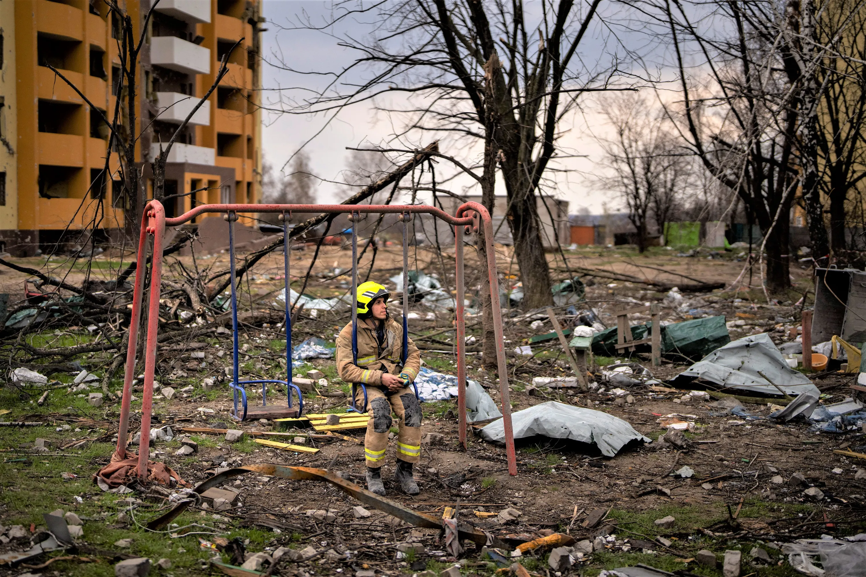 A firefighter sits on a swing next to a building destroyed by a Russian bomb in Chernihiv on Friday, April 22, 2022. (Photo by Emilio Morenatti/AP Photo)