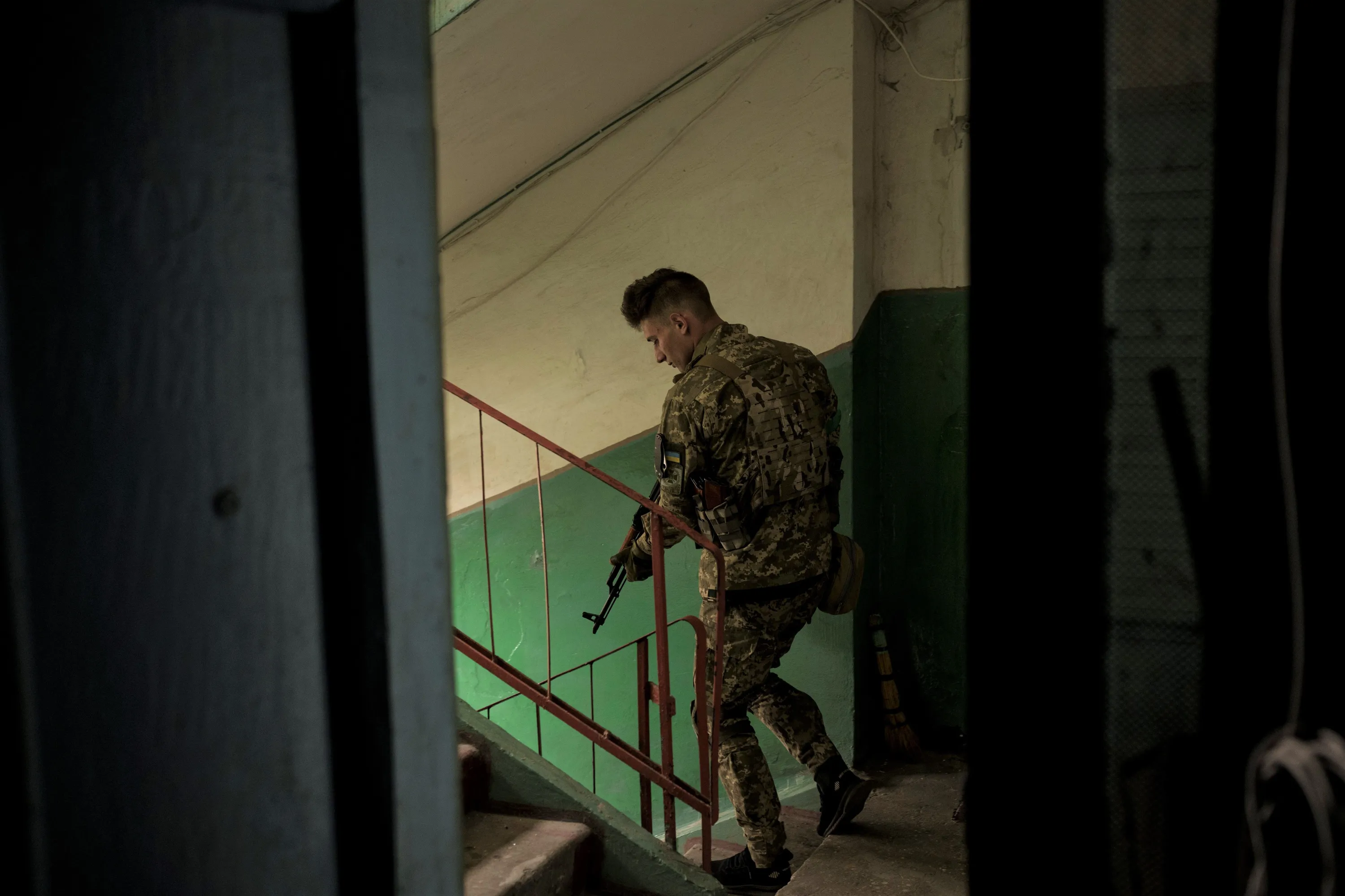A Ukrainian serviceman walks inside a building after searching the apartment of a man suspected of being a Russian collaborator in Kharkiv, Ukraine, Saturday, April 23, 2022. (Photo by Felipe Dana/AP Photo)