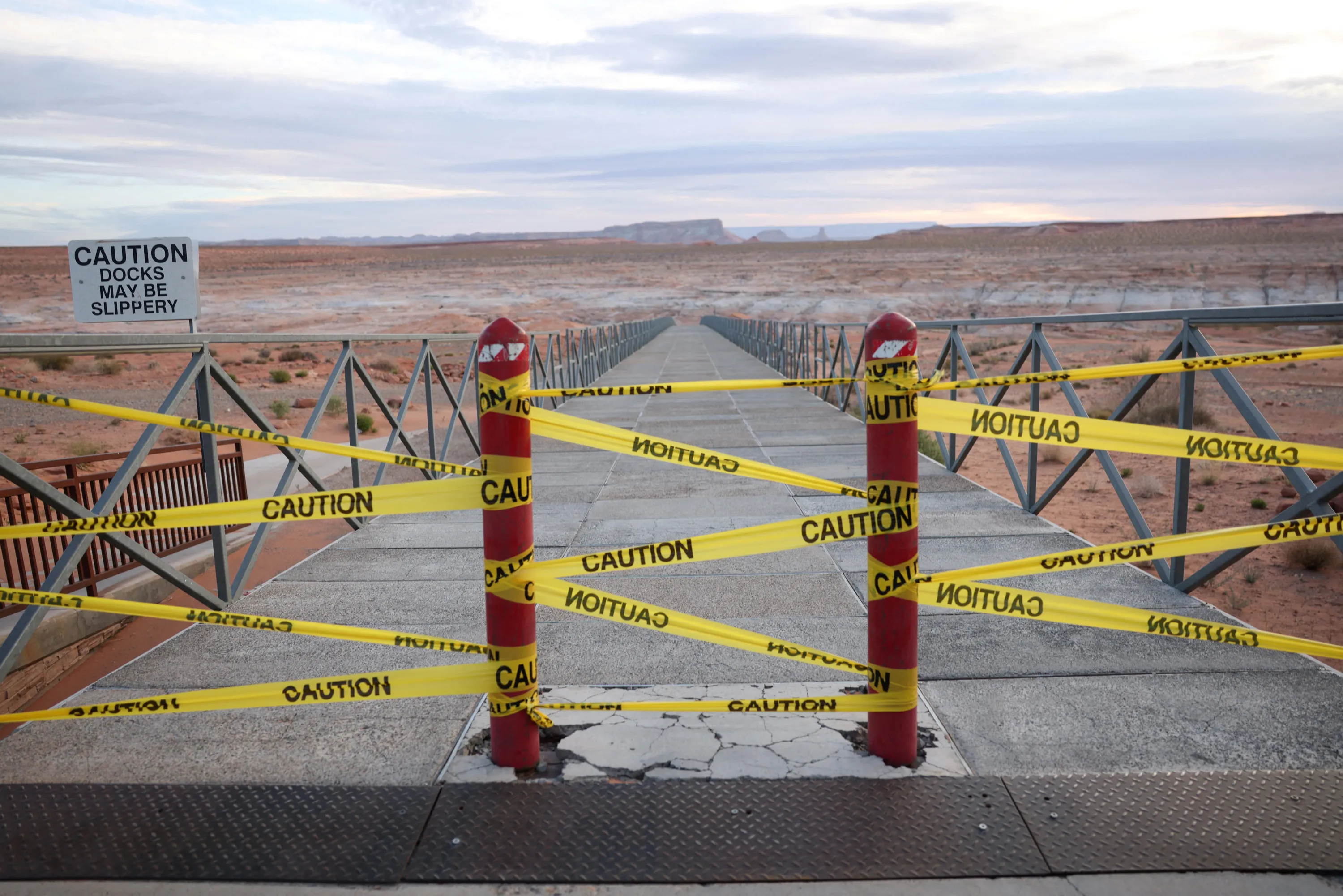 A closed boat ramp extends into desert sand at Lake Powell, where water levels have dropped dramatically to lows not seen since the lake was filled in the 1960s as growing demand for the river's water and climate change shrink the Colorado River and create challenges for business owners and recreation options in Page, Arizona, U.S., April 19, 2022. (Photo by Caitlin Ochs/Reuters)