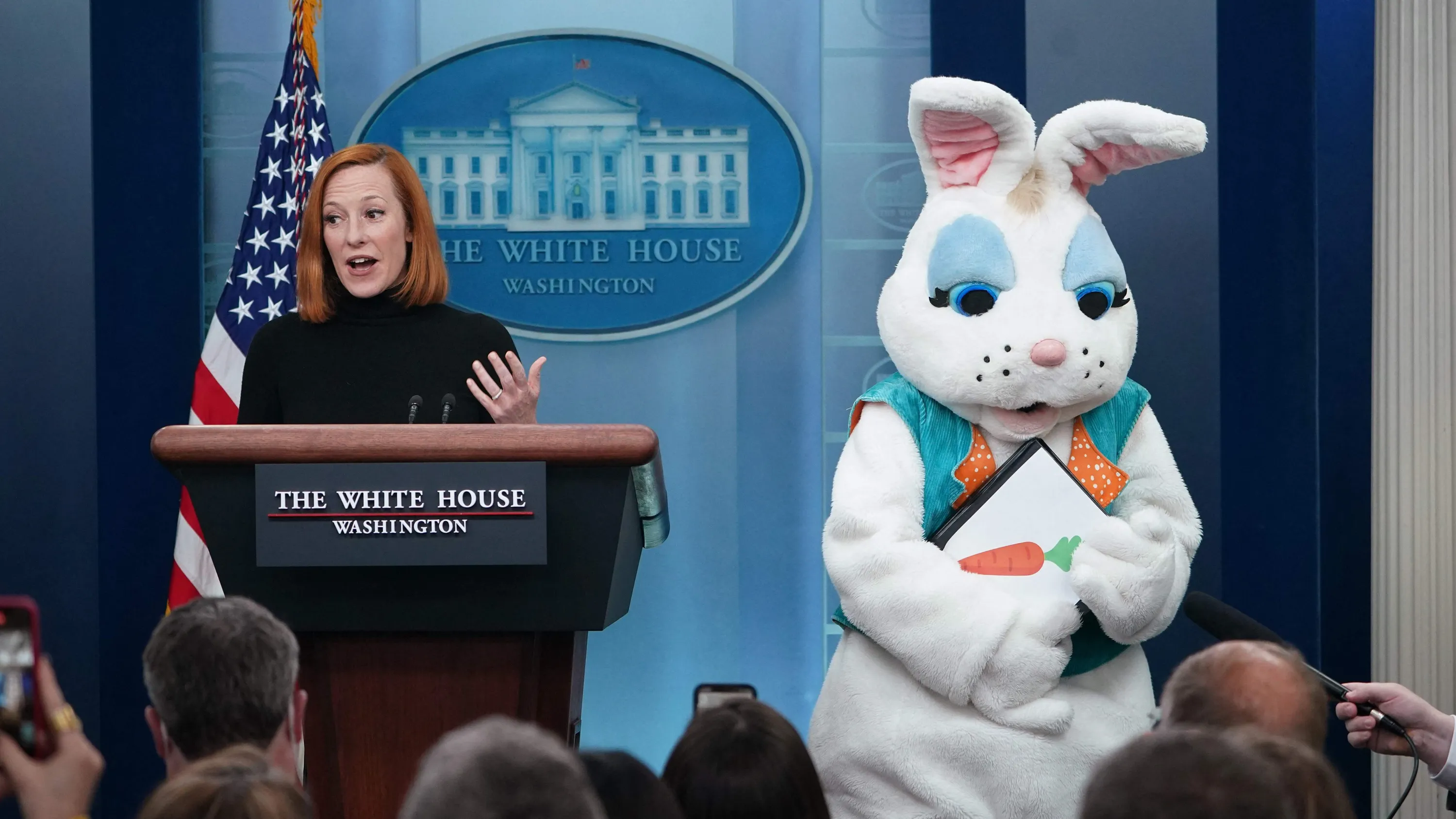 An Easter Bunny stands next to White House Press Secretary Jen Psaki as she delivers daily briefing in the Brady Briefing Room of the White House in Washington, DC on April 18, 2022. (Photo by Mandel Ngan/AFP Photo)